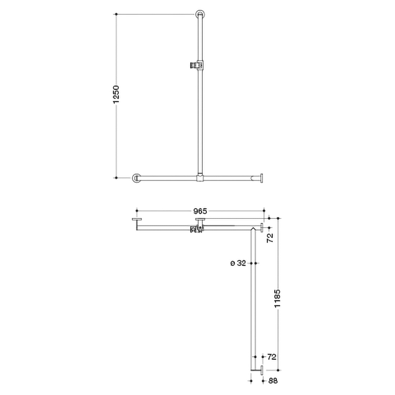 - senkrecht und waagerecht angeordnete, im rechten Winkel verbundene Stangen mit Befestigungsrosetten und Brausehalter