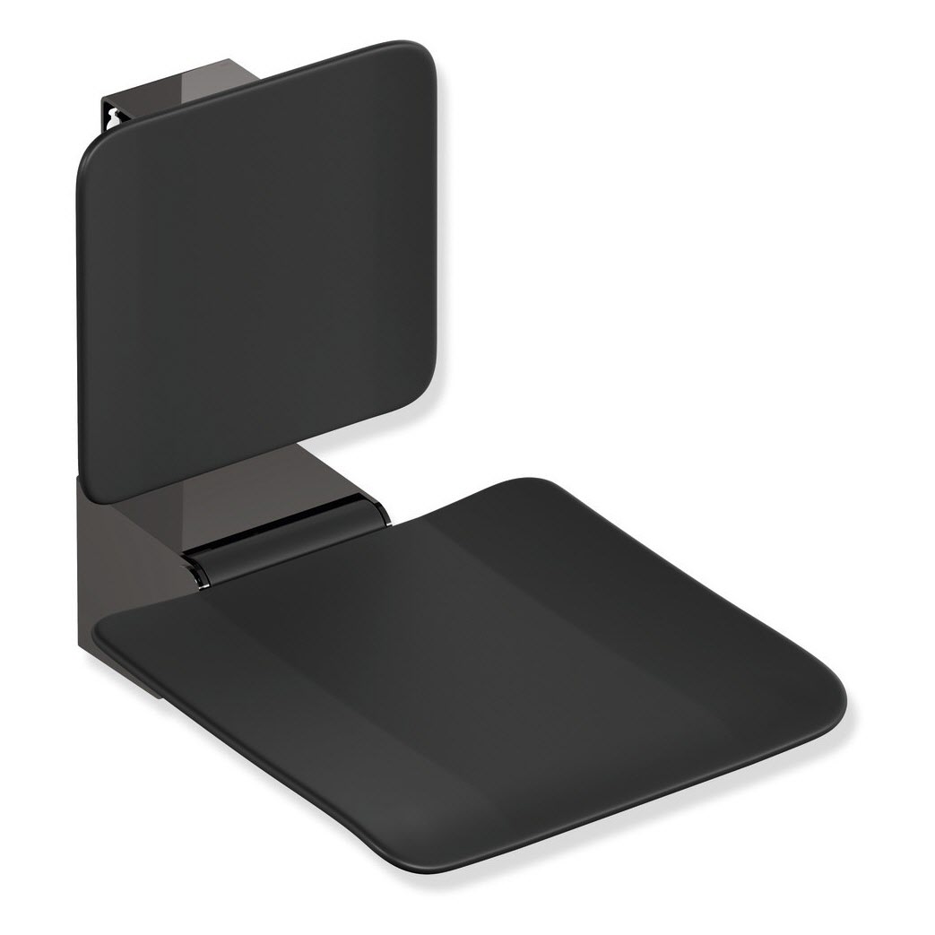- Klappsitz mit rutschhemmender, strukturierter Sitzfläche aus schwarzem Kunststoff
