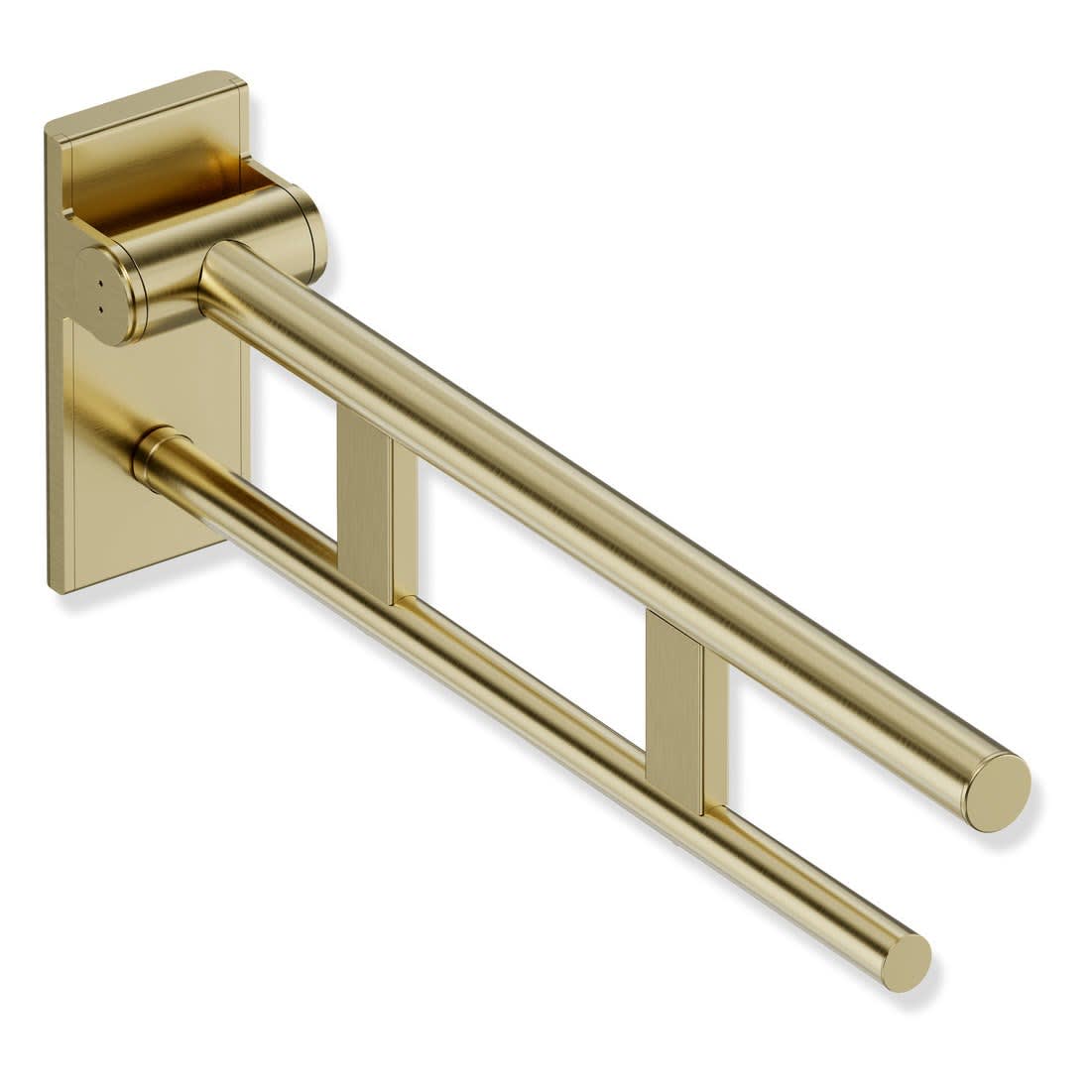 Die Stützklappgriffe von System 900 verfügen über eine wartungsfreie Bremse. Diese dämpft das Absenken des Stützklappgriffs. Der Holm lässt sich mit geringem Kraftaufwand nach oben und unten bewegen. Ist der Winkel größer als 45 °, verweilt der Stützklappgriff in jeder beliebigen Position und kann mit geringer Kraft abgesenkt oder zur Wand geklappt werden. Ab einem Winkel von 45 ° senkt sich der Holm automatisch sanft ab.