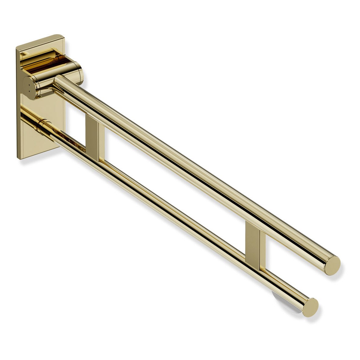 Die Stützklappgriffe von System 900 verfügen über eine wartungsfreie Bremse. Diese dämpft das Absenken des Stützklappgriffs. Der Holm lässt sich mit geringem Kraftaufwand nach oben und unten bewegen. Ist der Winkel größer als 45 °, verweilt der Stützklappgriff in jeder beliebigen Position und kann mit geringer Kraft abgesenkt oder zur Wand geklappt werden. Ab einem Winkel von 45 ° senkt sich der Holm automatisch sanft ab.