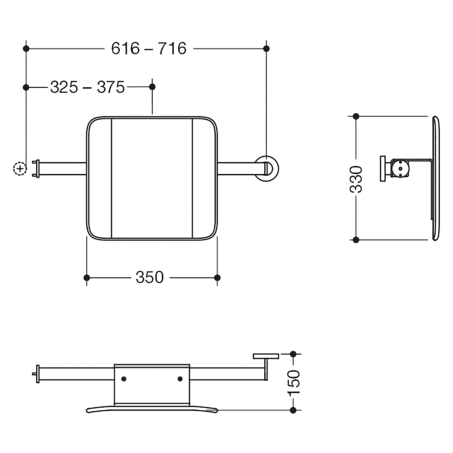 - Achsmaß bauseits verstellbar (lichtes Maß zwischen dem Holm des Stützklappgriffs und dem Achsmaß der Wandbefestigung 61,6-71,6 cm)