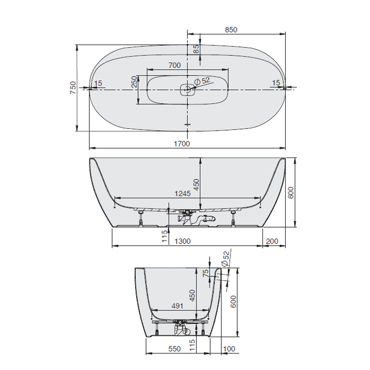 Hoesch iSENSI MONOLITH Ovalwanne 170 x 75 cm freihstehend, mit Überlaufbefüllung