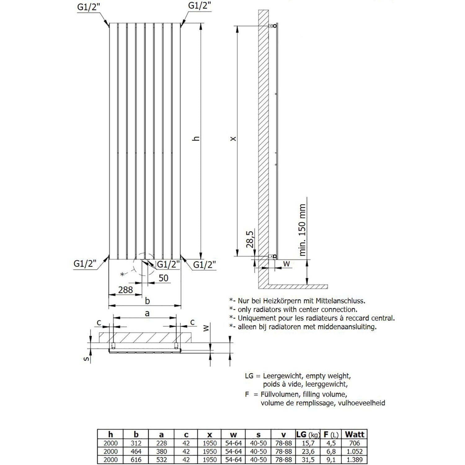 HSK Alto Badheizkörper 60,2 x 200 cm, Anschlüsse mittig