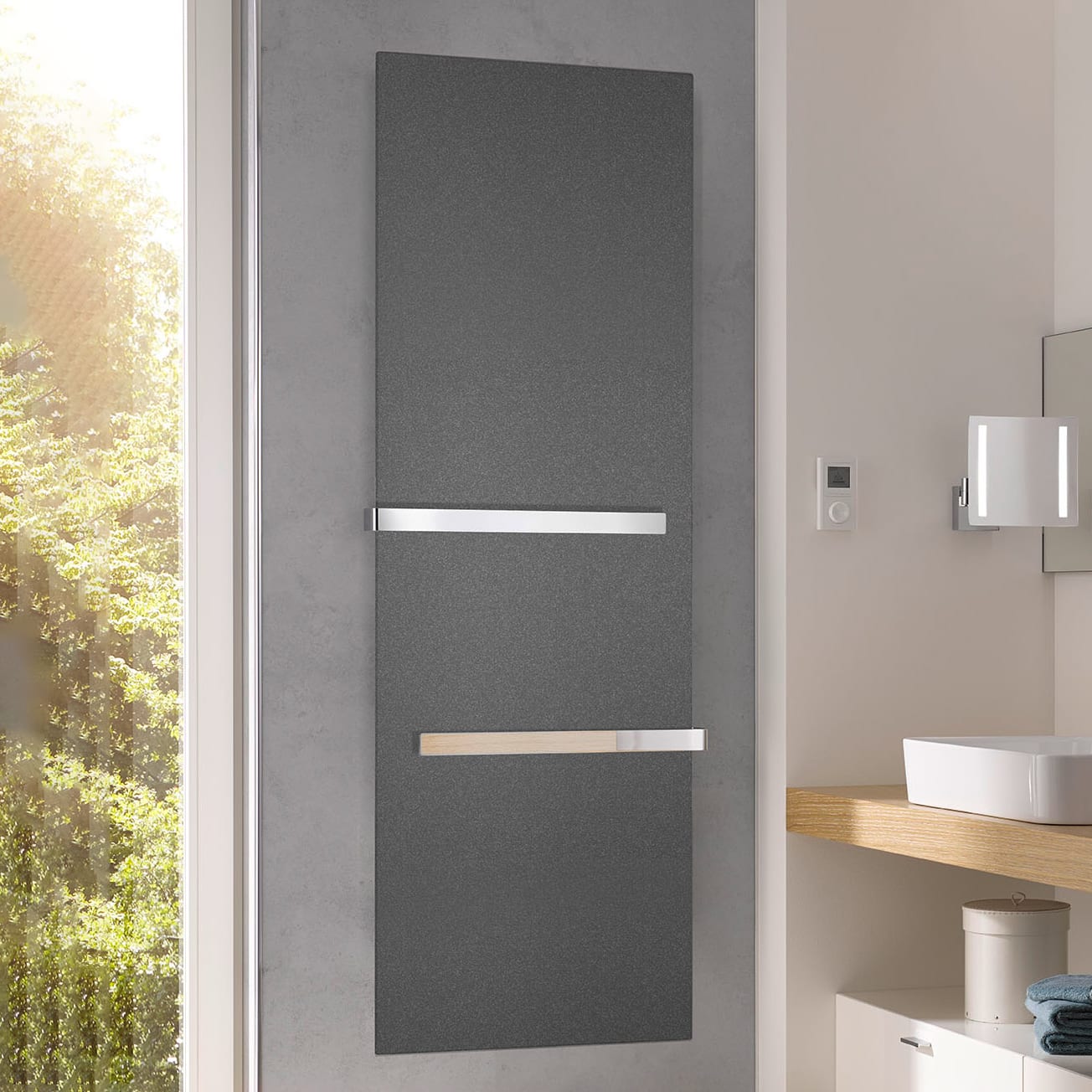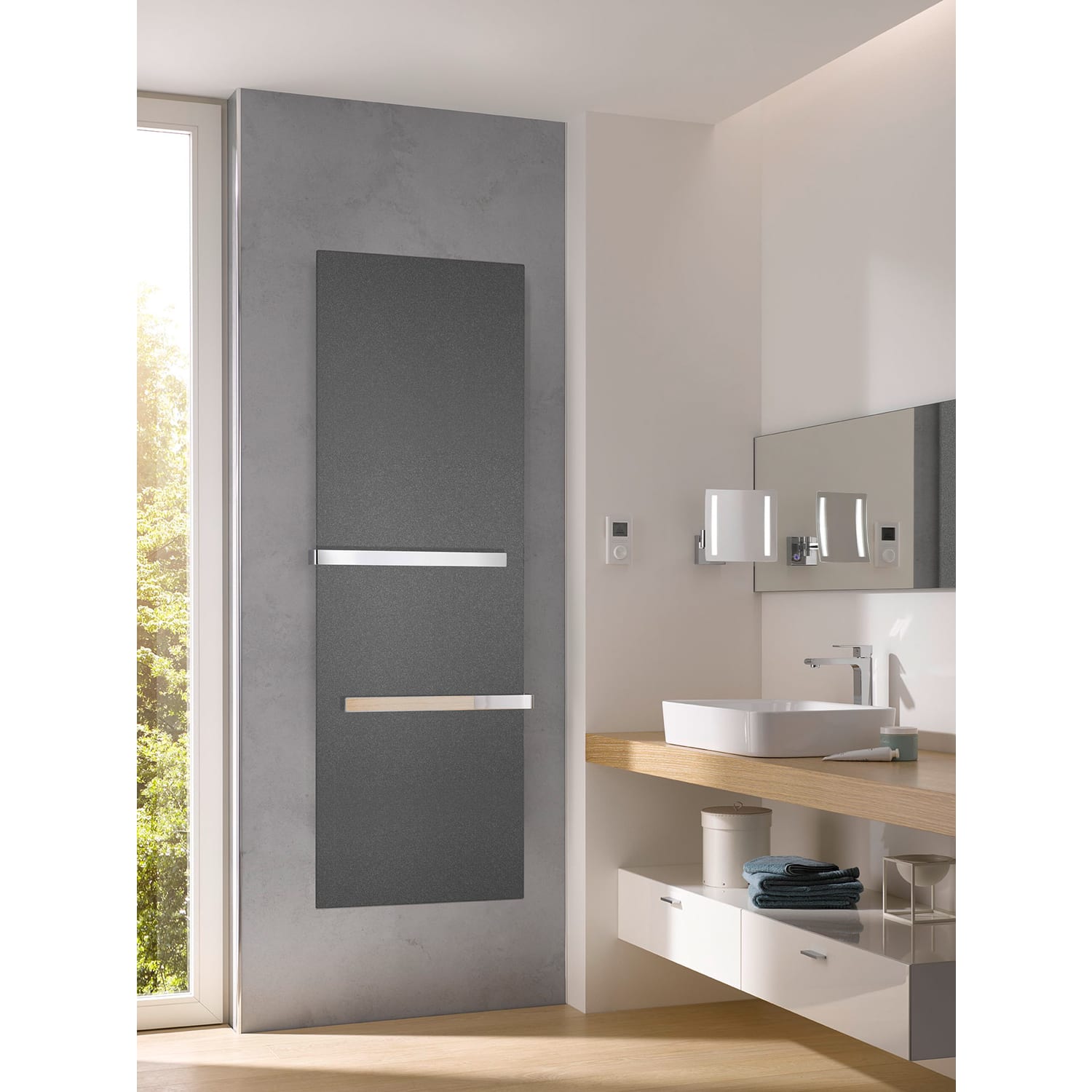 - duale Heiztechnik: oberer Bereich volle Heizleistung von 95°C, unterer Bereich hinter Handtuchhalter max. 65°C