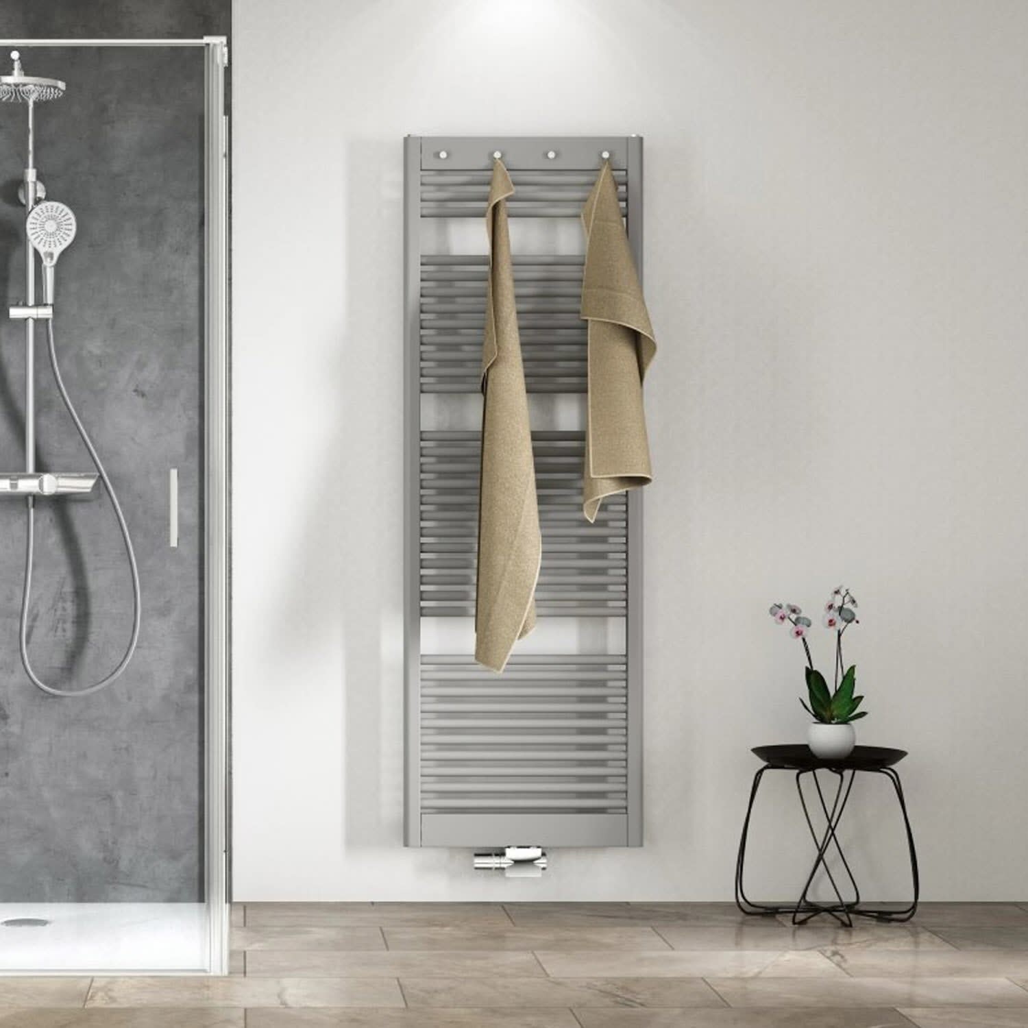 - mit 4 verchromten Handtuchhaken zum Vorwärmen oder Trocknen der Handtücher