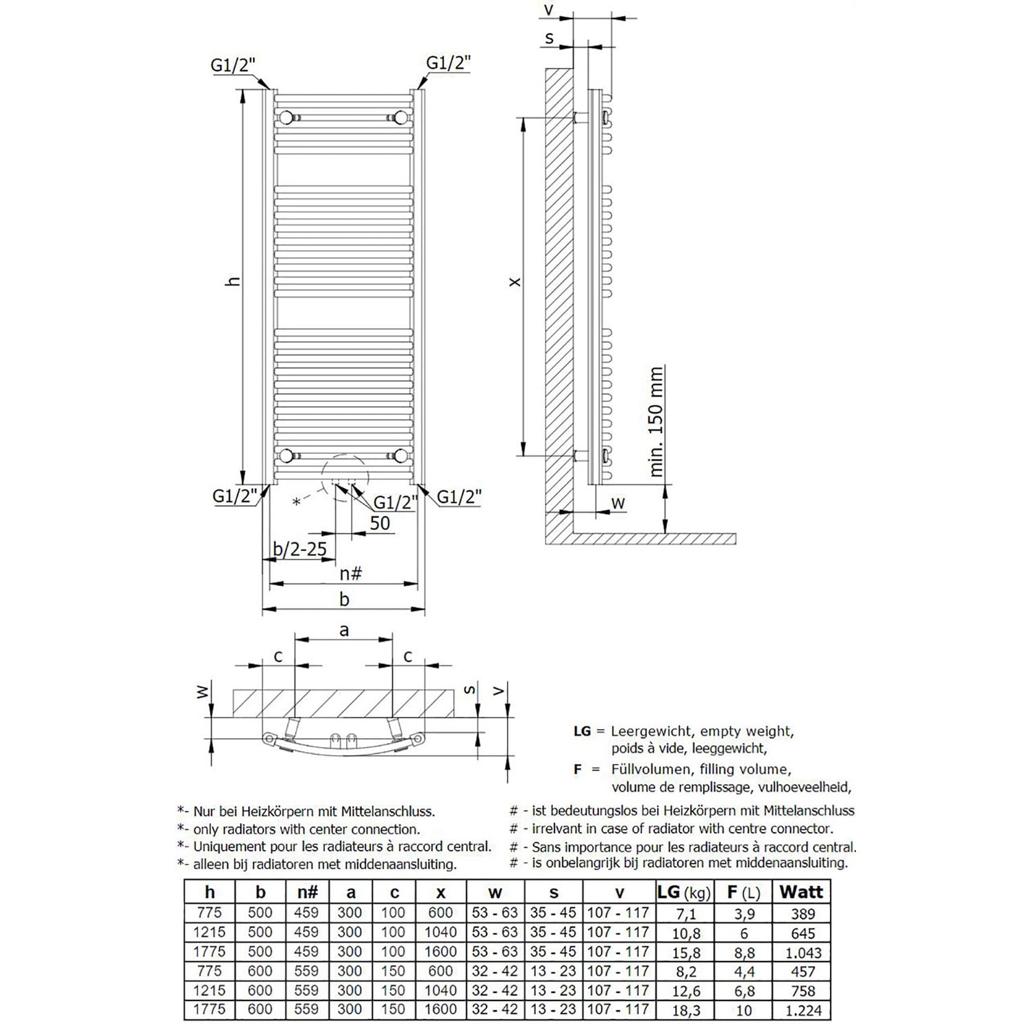 - Vorlauf und Rücklauf seitlich unten links und rechts 1/2"