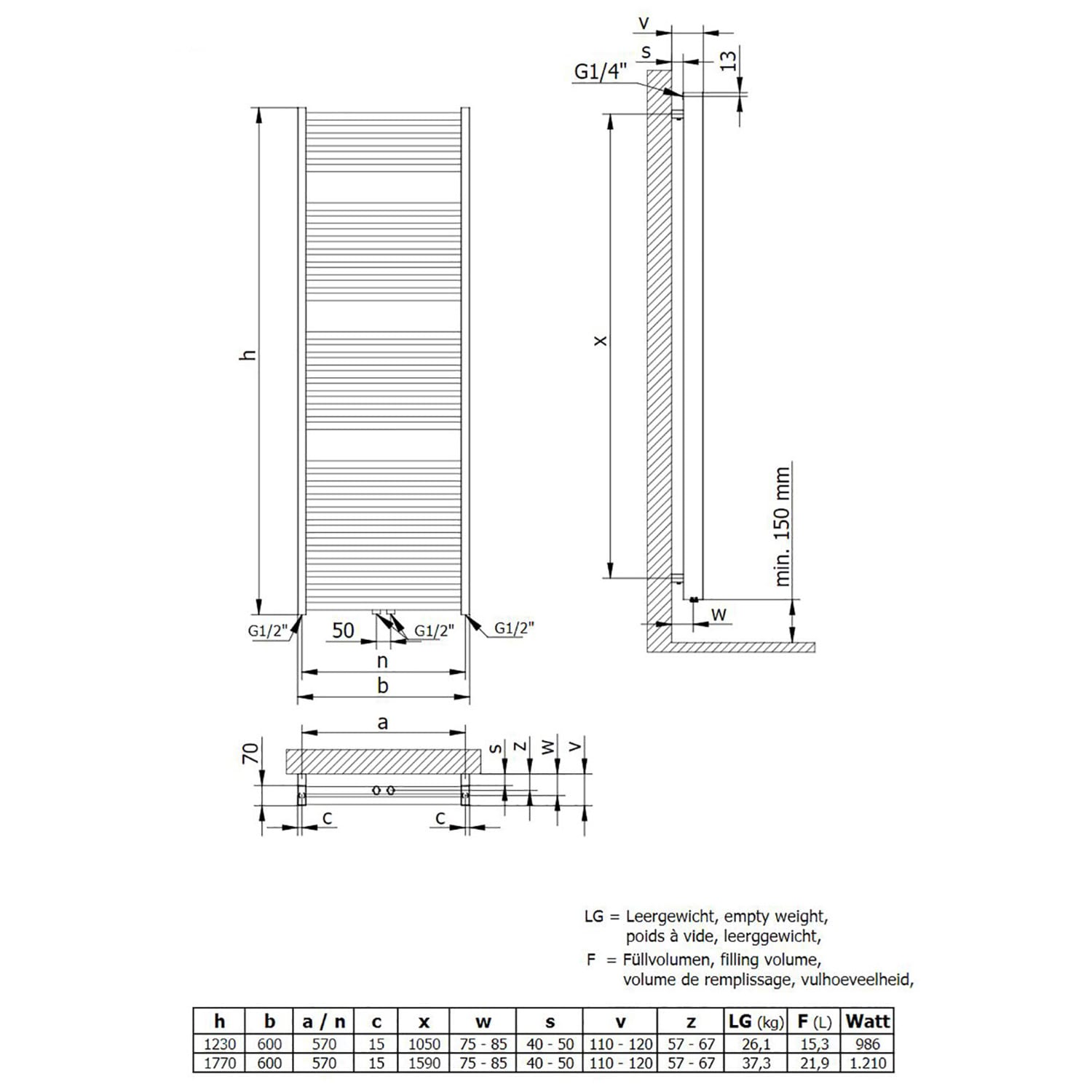 - Anschlussart: Vorlauf unten mittig links, mittig rechts / Rücklauf unten mittig links, mittig rechts