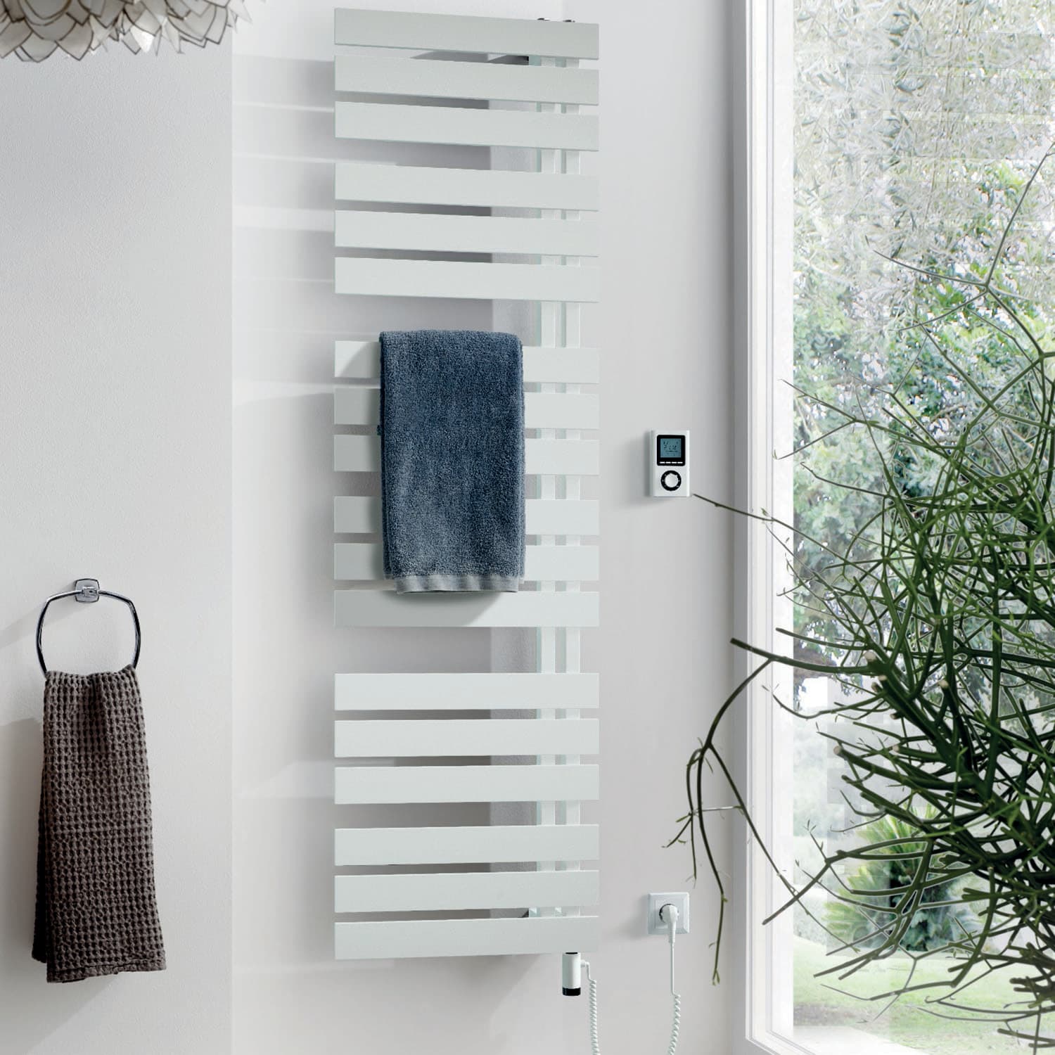 - Designheizkörper mit offener Anordnung der Heizlamellen für bequemes Überhängen von Handtüchern