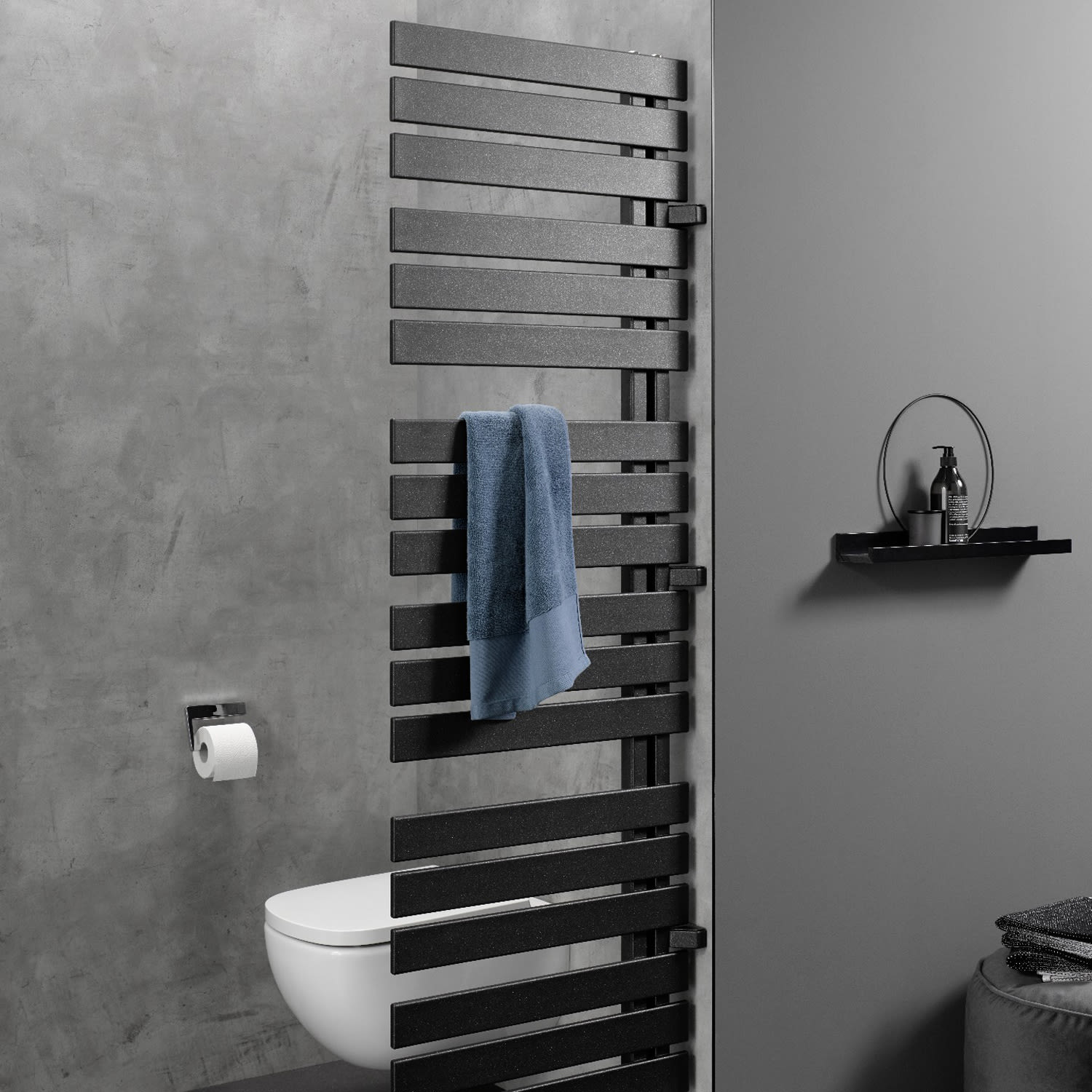 - Designheizkörper mit offener Anordnung der Heizlamellen für bequemes Überhängen von Handtüchern