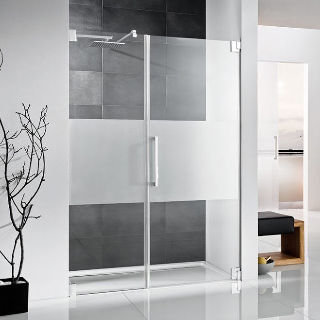 Diese rahmenlose Drehtür ist eine optimale Lösung für die Nische und wird von hochwertigen Pendelbeschlägen gehalten. Diese Variante verfügt über ein breites Nebenteil, wodurch sie auch in größere Raumnischen passt.