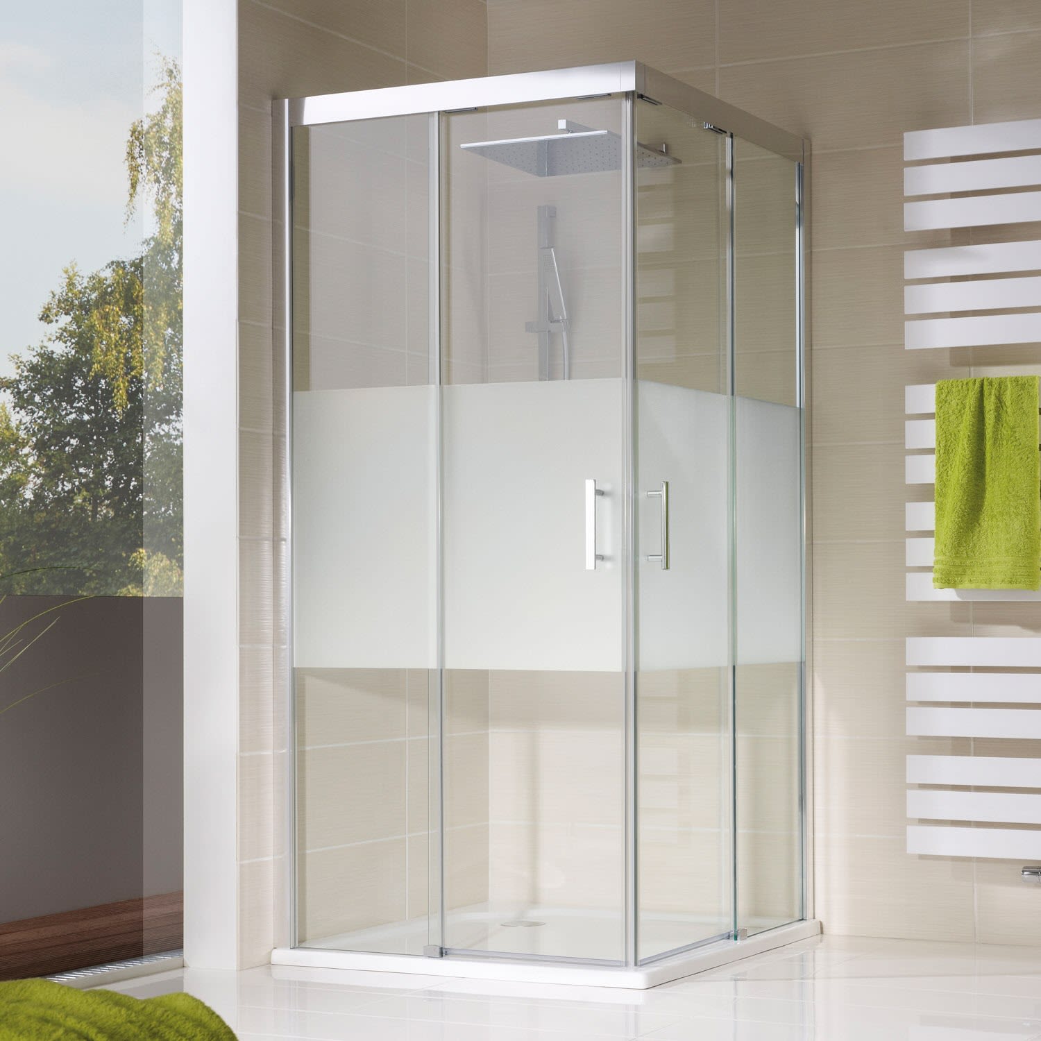 Auf Wunsch ist die Verglasung mit einer Edelglas-Beschichtung möglich. Diese einseitig aufgetragene Beschichtung minimiert das Antrocknen von Wassertropfen und das Festsetzen von Schmutz und Kalk. Die Reinigung der Verglasung wird damit erleichtert - allerdings nicht erspart.