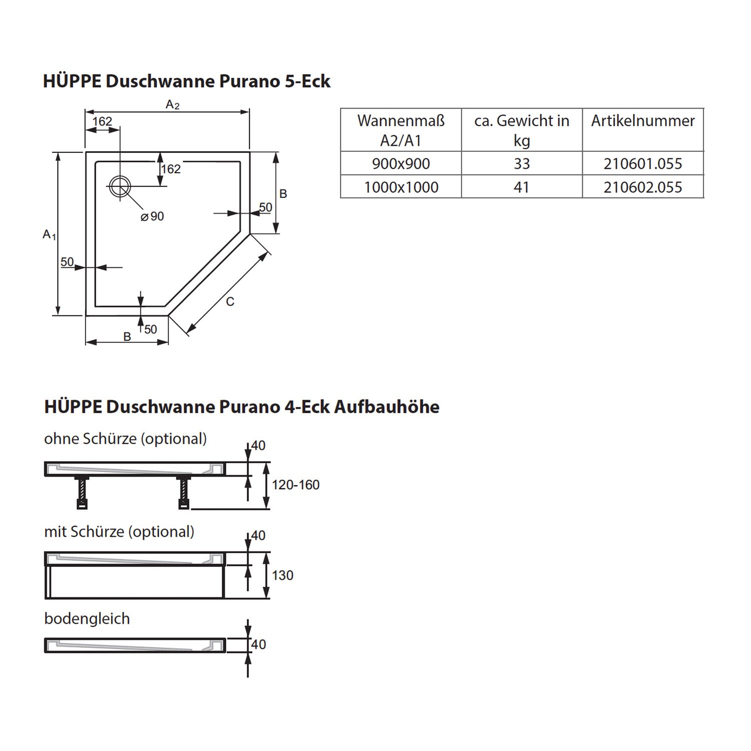 HÜPPE Purano 5-Eck Duschwanne 90 x 90 cm