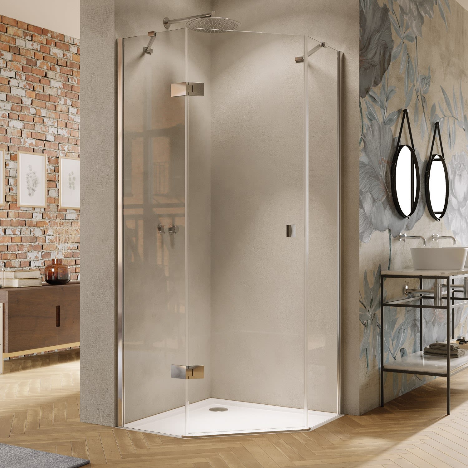 - teilgerahmte Fünfeck-Duschkabine mit einem Glasflügel, nach innen und außen öffnend und zwei Festfeldern