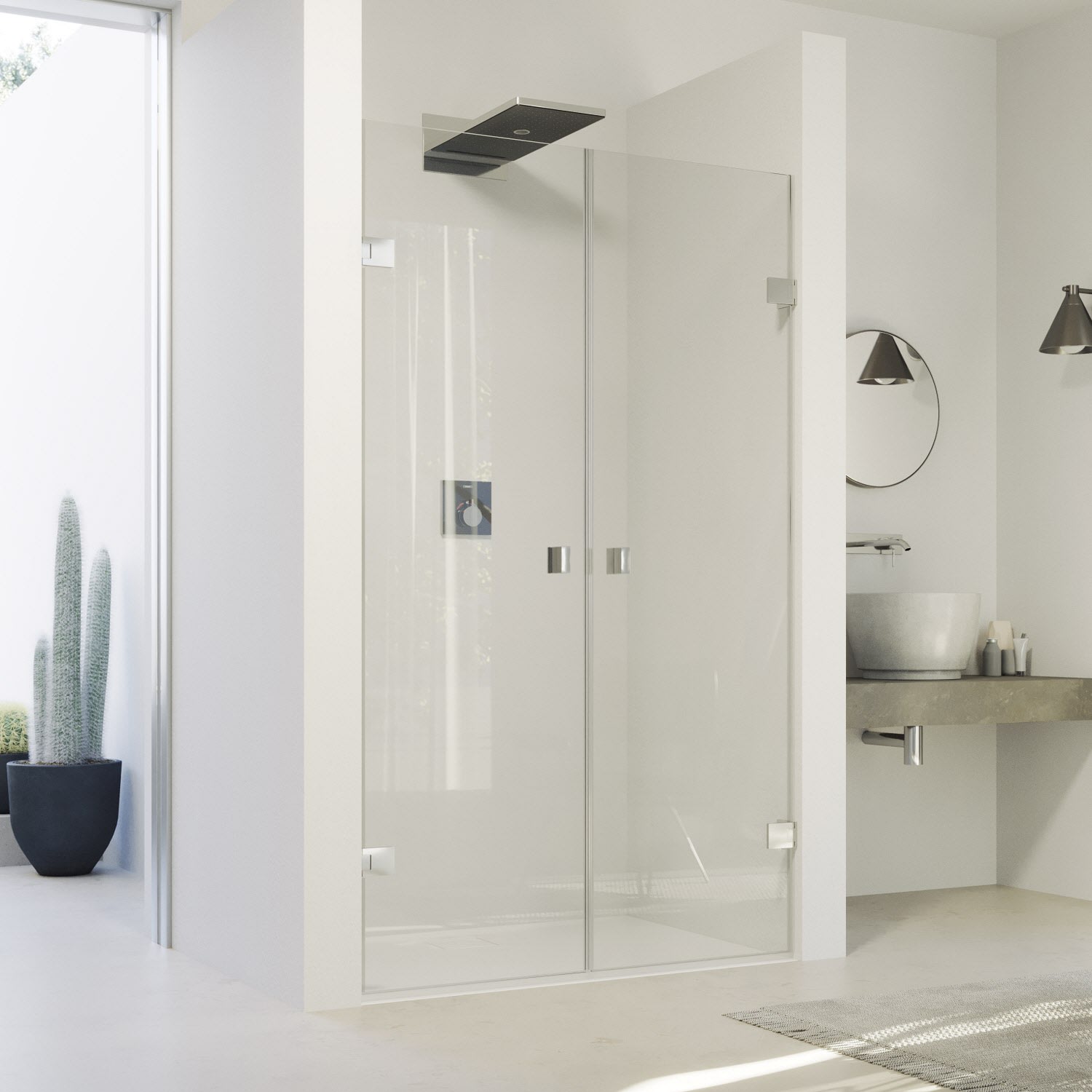 - Rahmenlose Tür mit zwei Glasflügeln, nach innen und außen öffnend