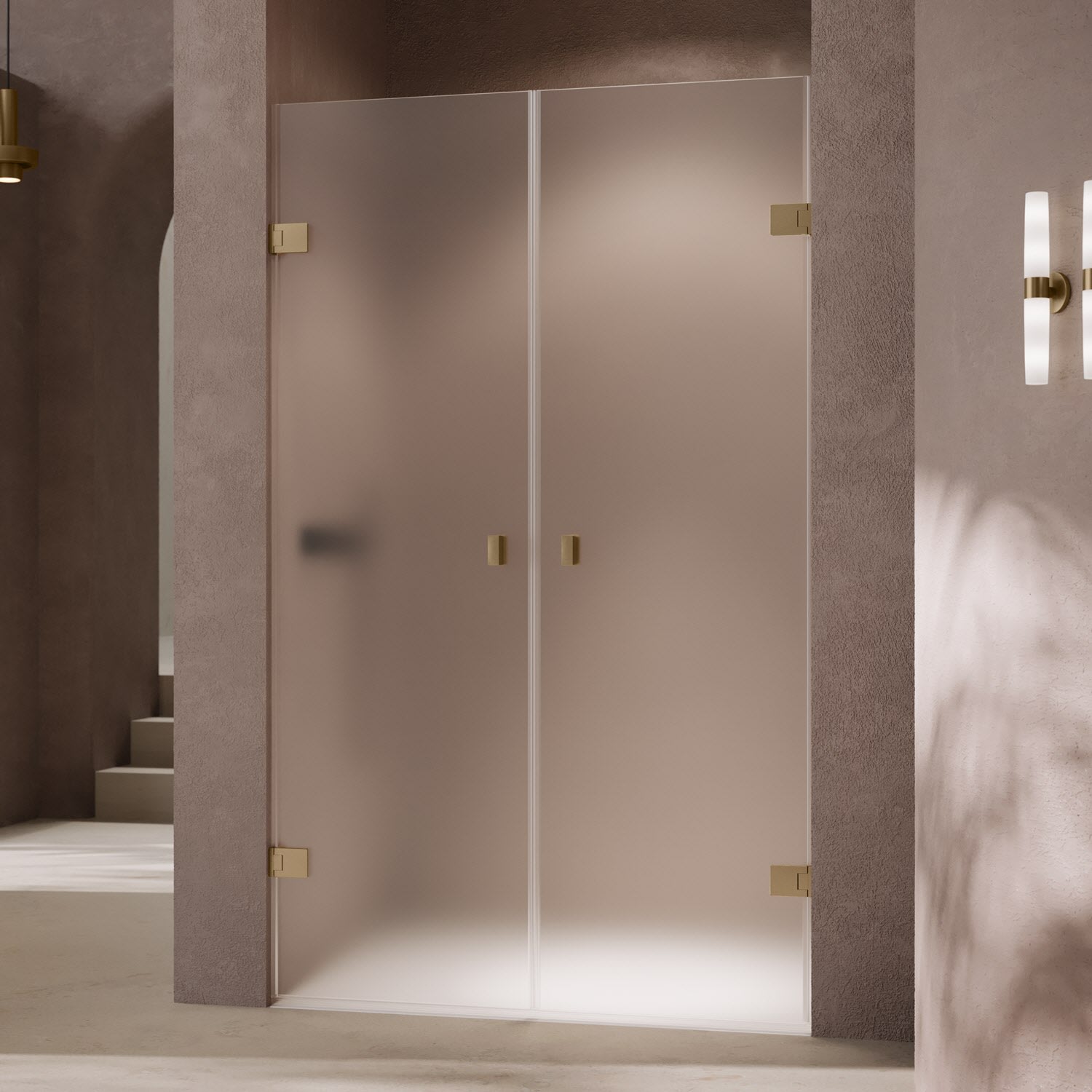 - Rahmenlose Tür mit zwei Glasflügeln, nach innen und außen öffnend