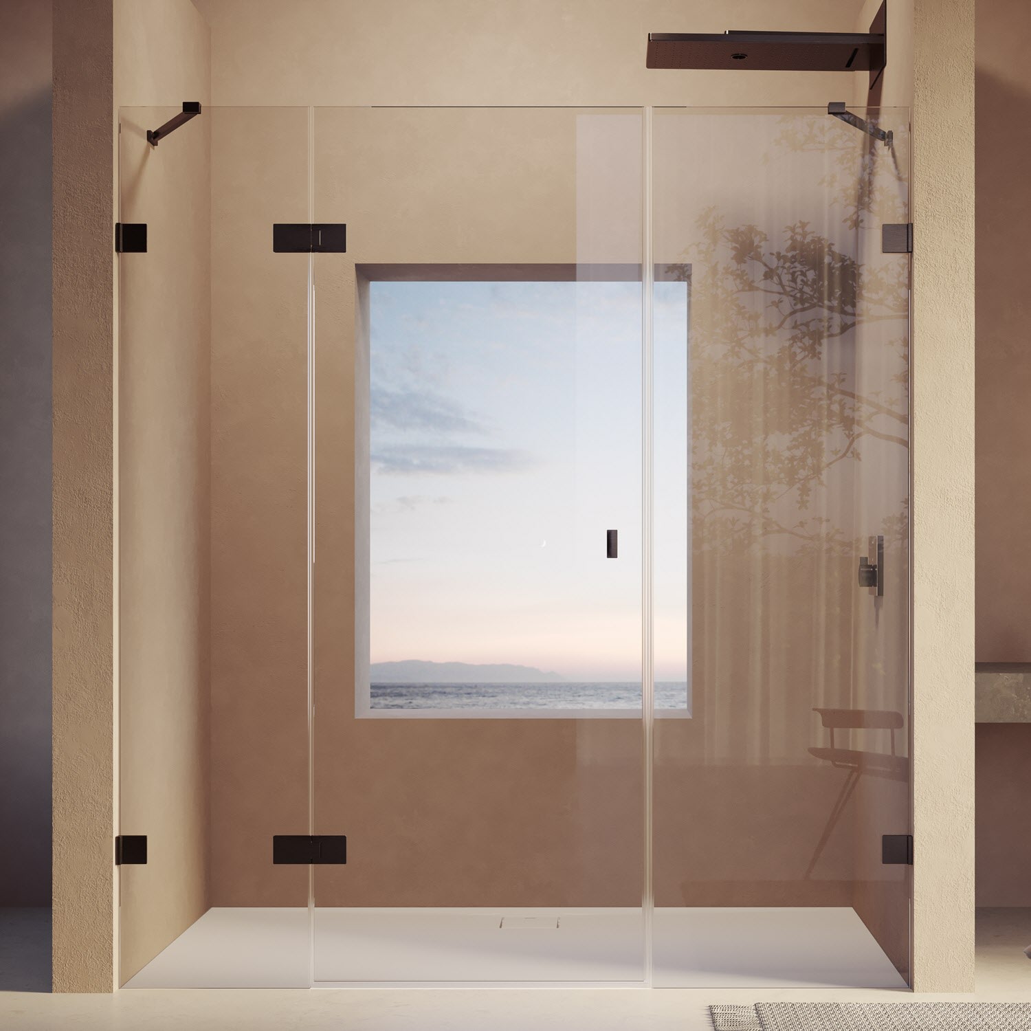 - Rahmenlose Tür mit einem Glasflügel, nach innen und außen öffnend, mit einem festen Segment und Nebenteil