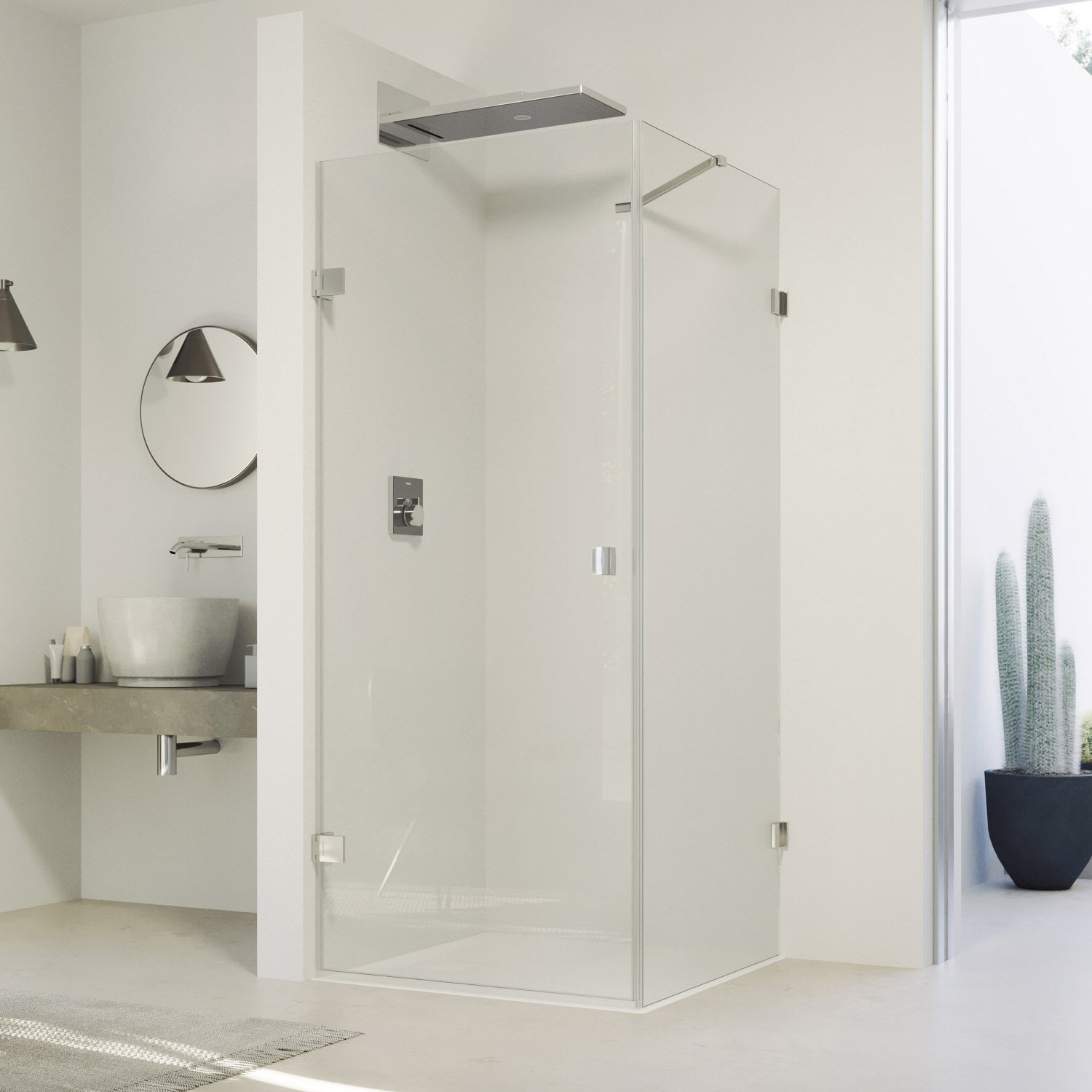 - Rahmenlose Tür mit einem Glasflügel, nach innen und außen öffnend, mit rahmenloser Seitenwand
