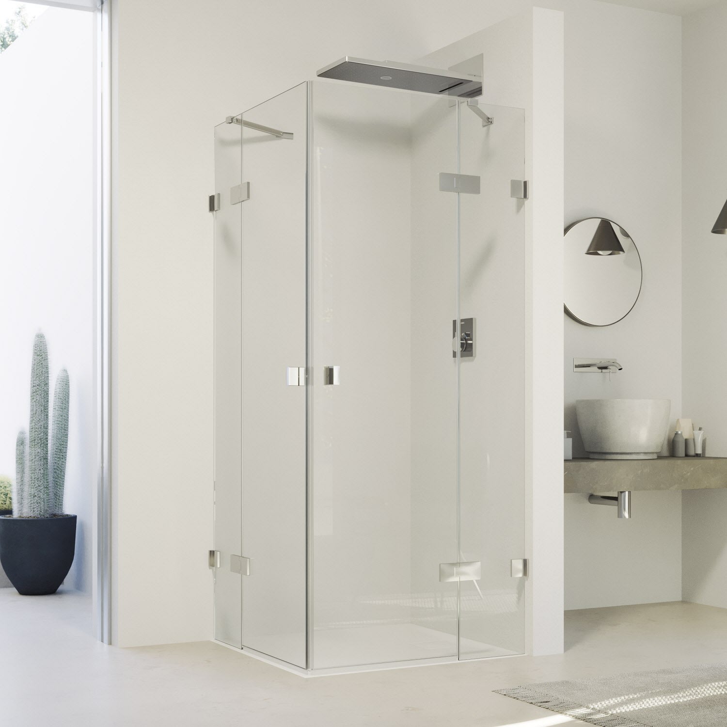 - Rahmenloser Eckeinstieg mit zwei Glasflügeln, nach innen und außen öffnend, mit zwei Festfeldern