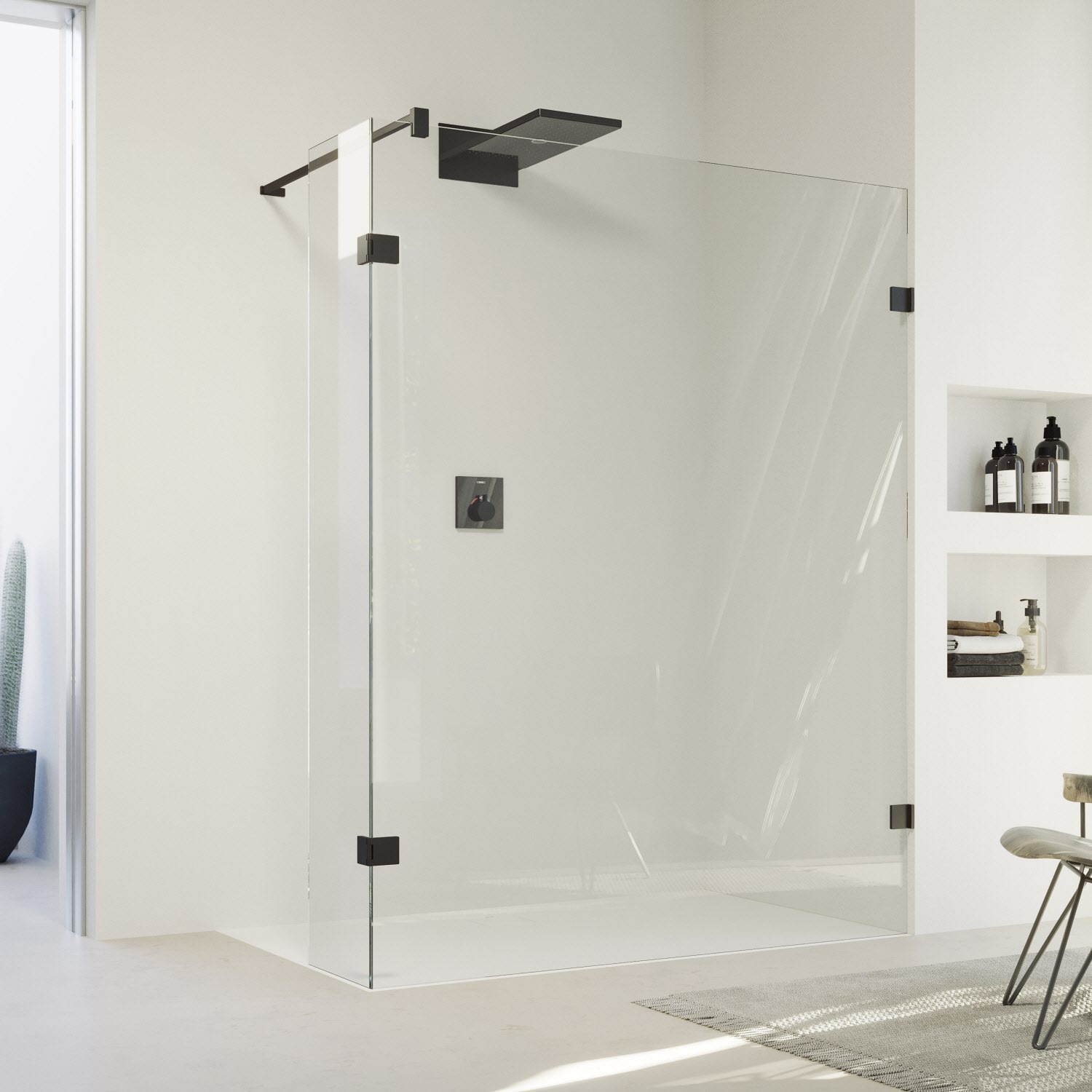 - Rahmenlose Walk-In-Glasanlage mit beweglichem Segment nach innen und außen öffnend
