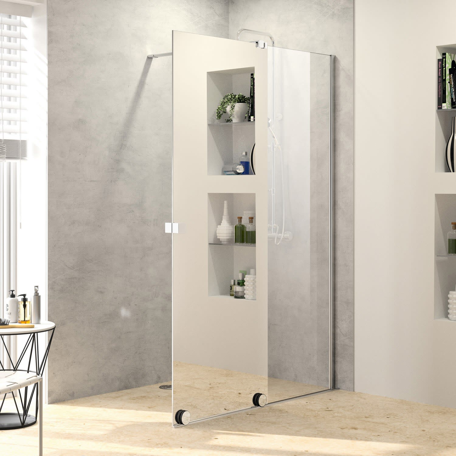 - teilgerahmte Walk-In mit einem Gleittürsegment, nach einer Seite öffnend, mit einem teilgerahmten festen Segment