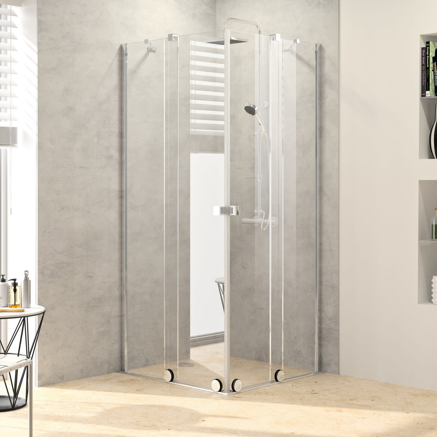 - teilgerahmte Eckeinstiegshälfte mit zwei Gleittürsegmenten, nach einer Seite öffnend, mit festen Segmenten