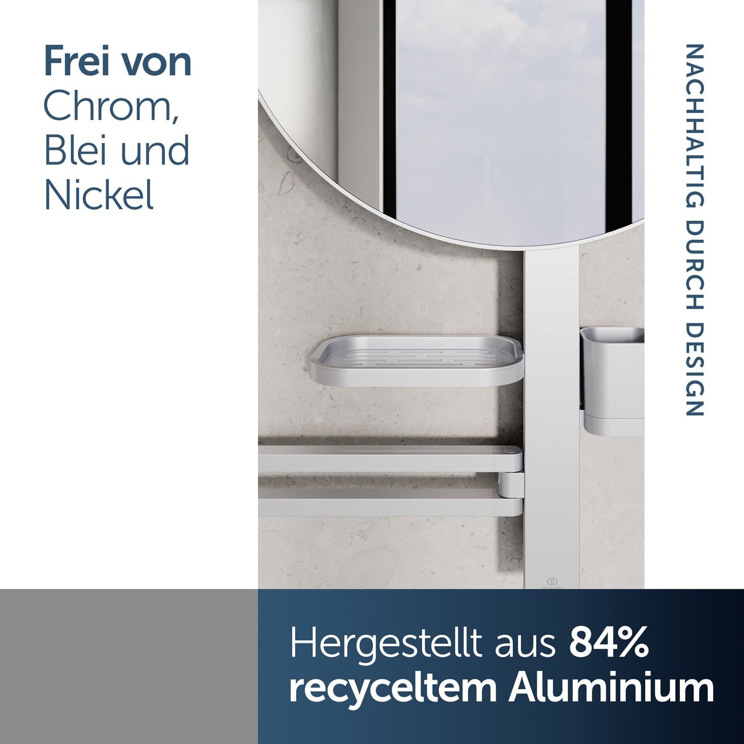 Die Alu+ Beauty Bar (Accessoires-Kombination L) von Ideal Standard ist nachhaltig, da es aus 84 % recyceltem Aluminium hergestellt wird und 100 % recycelbar ist. Die Verwendung von recyceltem Aluminium reduziert den Ressourcenverbrauch und minimiert Abfall. Sie ist frei von Chrom, Blei und Nickel. Die Alu+ Beauty Bar ist Teil eines nachhaltigen Ansatzes für die Badgestaltung, der die Umwelt schont.
