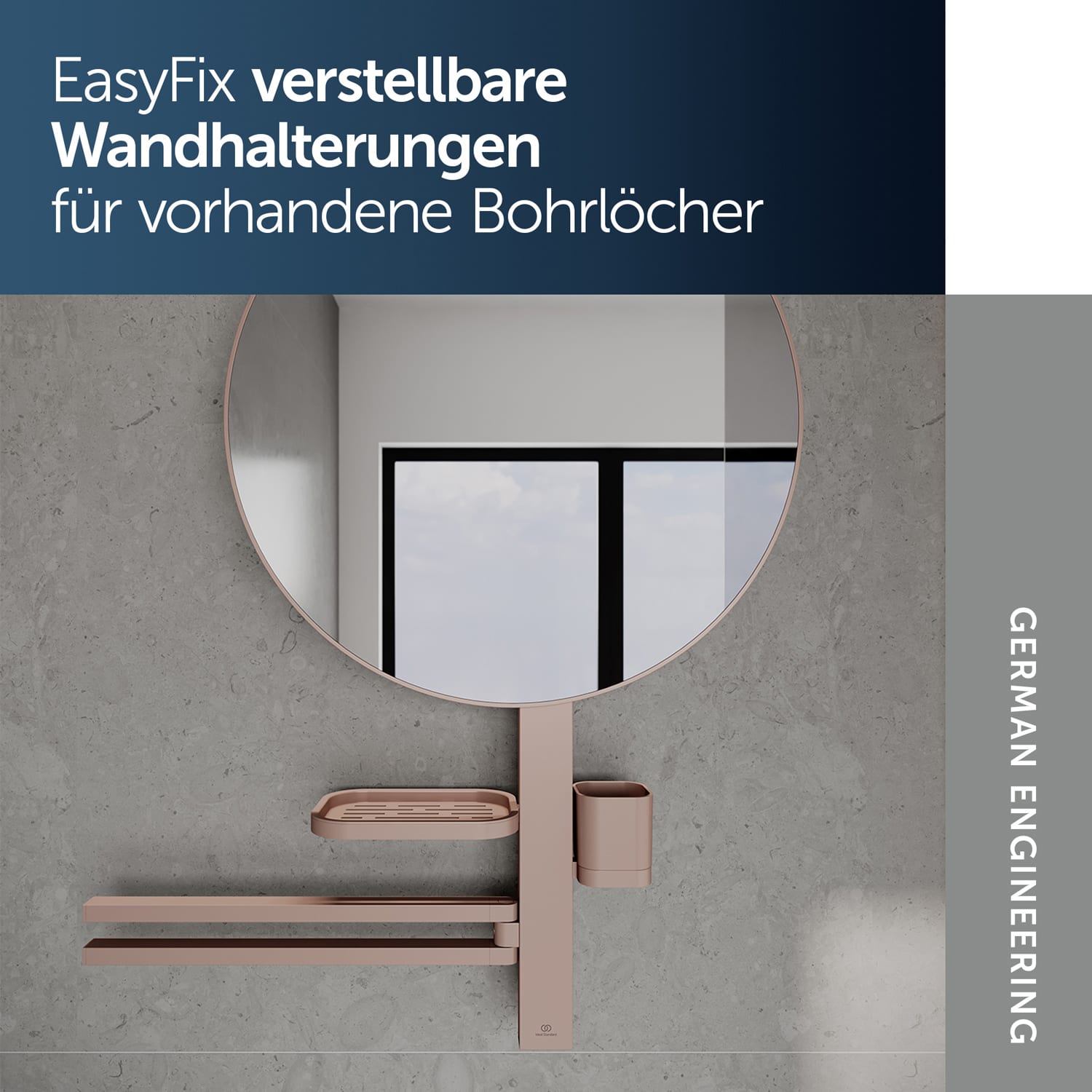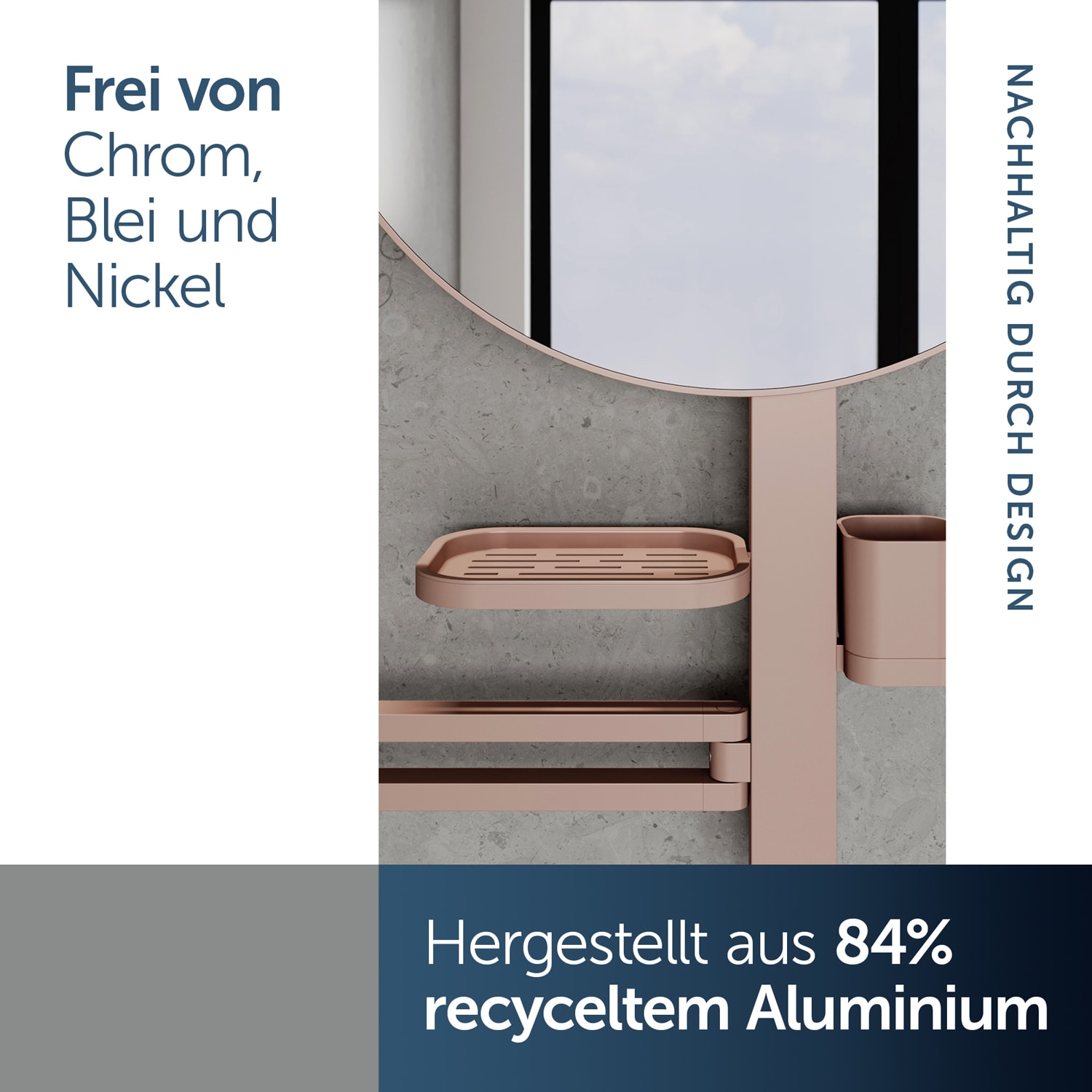 Die Alu+ Beauty Bar (Accessoires-Kombination L) von Ideal Standard ist nachhaltig, da es aus 84 % recyceltem Aluminium hergestellt wird und 100 % recycelbar ist. Die Verwendung von recyceltem Aluminium reduziert den Ressourcenverbrauch und minimiert Abfall. Sie ist frei von Chrom, Blei und Nickel. Die Alu+ Beauty Bar ist Teil eines nachhaltigen Ansatzes für die Badgestaltung, der die Umwelt schont.