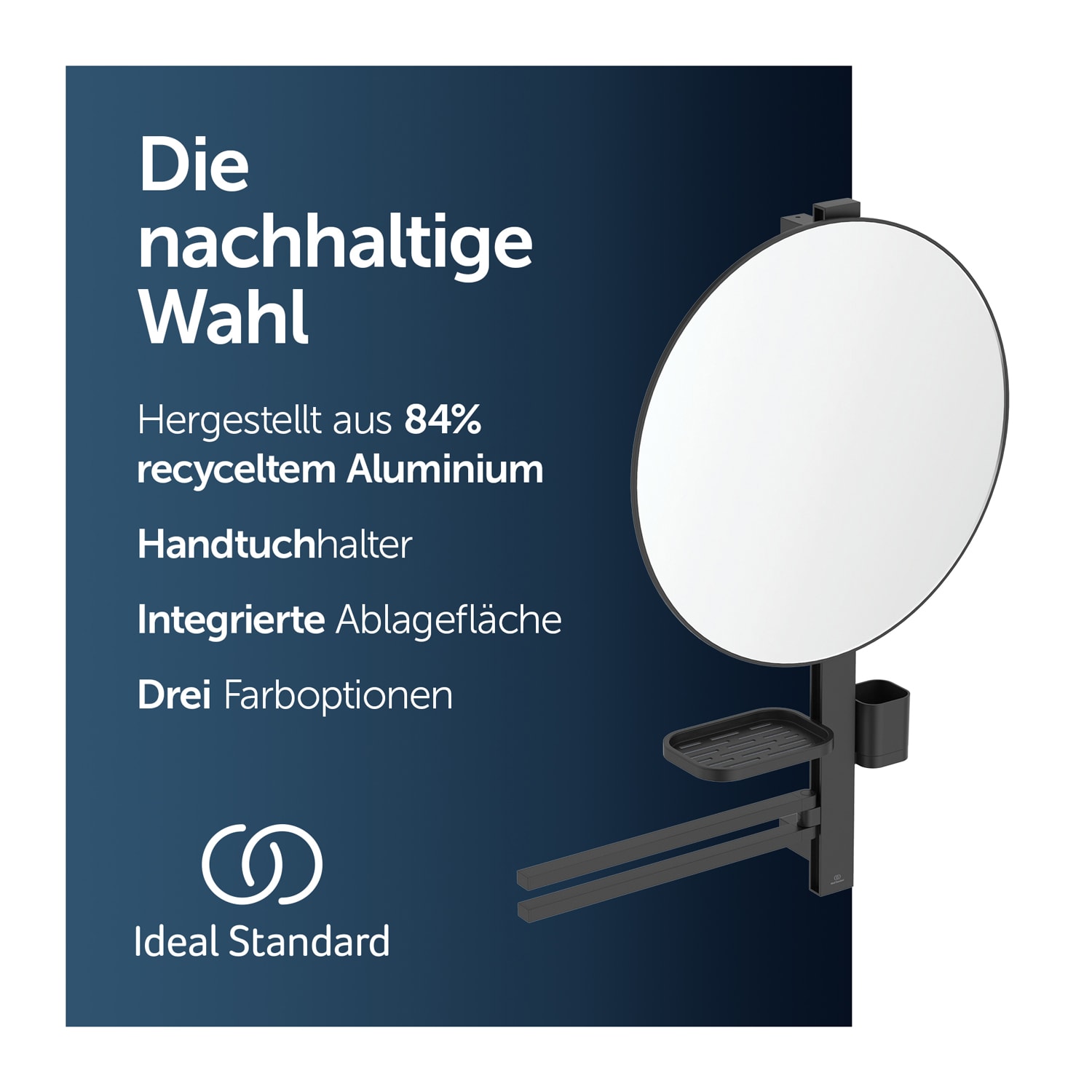 Die Alu+ Beauty Bar (Accessoires-Kombination L) von Ideal Standard ist nachhaltig, da es aus 84 % recyceltem Aluminium hergestellt wird und 100 % recycelbar ist. Die Verwendung von recyceltem Aluminium reduziert den Ressourcenverbrauch und minimiert Abfall. Sie ist frei von Chrom, Blei und Nickel. Die Alu+ Beauty Bar ist Teil eines nachhaltigen Ansatzes für die Badgestaltung, der die Umwelt schont.