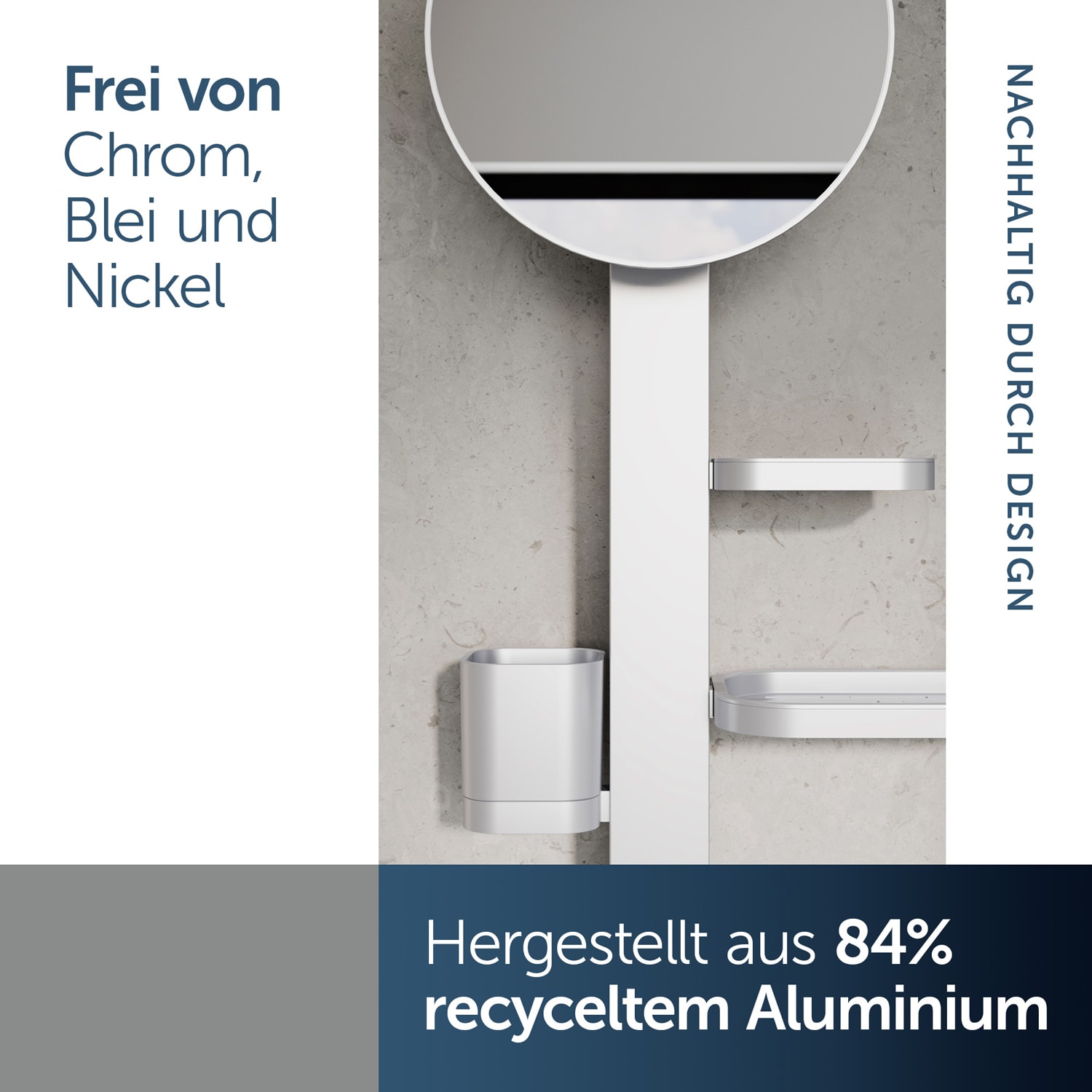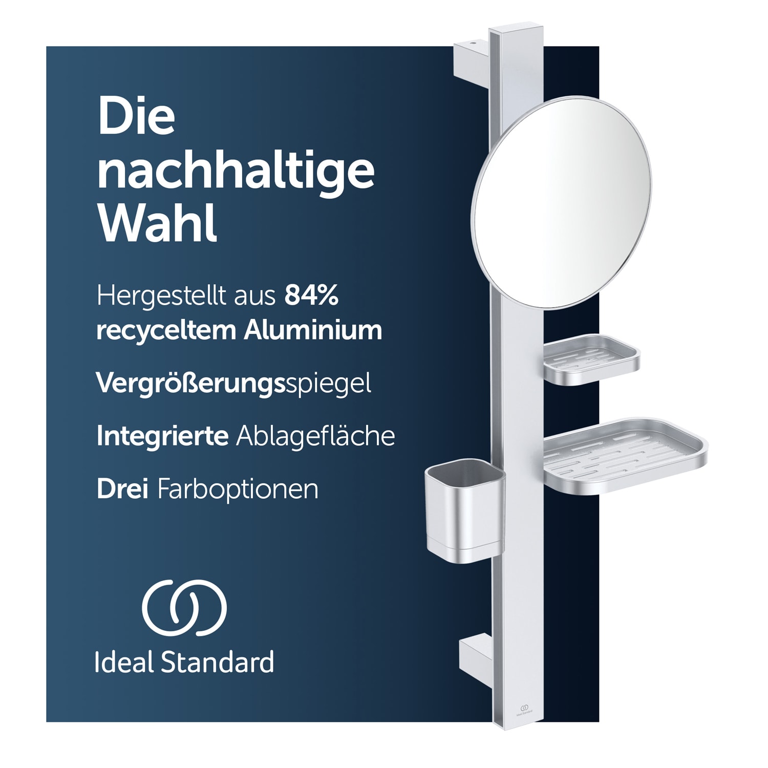 Die Alu+ Beauty Bar (Accessoires-Kombination S) von Ideal Standard ist nachhaltig, da es aus 84 % recyceltem Aluminium hergestellt wird und 100 % recycelbar ist. Die Verwendung von recyceltem Aluminium reduziert den Ressourcenverbrauch und minimiert Abfall. Sie ist frei von Chrom, Blei und Nickel. Die Alu+ Beauty Bar ist Teil eines nachhaltigen Ansatzes für die Badgestaltung, der die Umwelt schont.