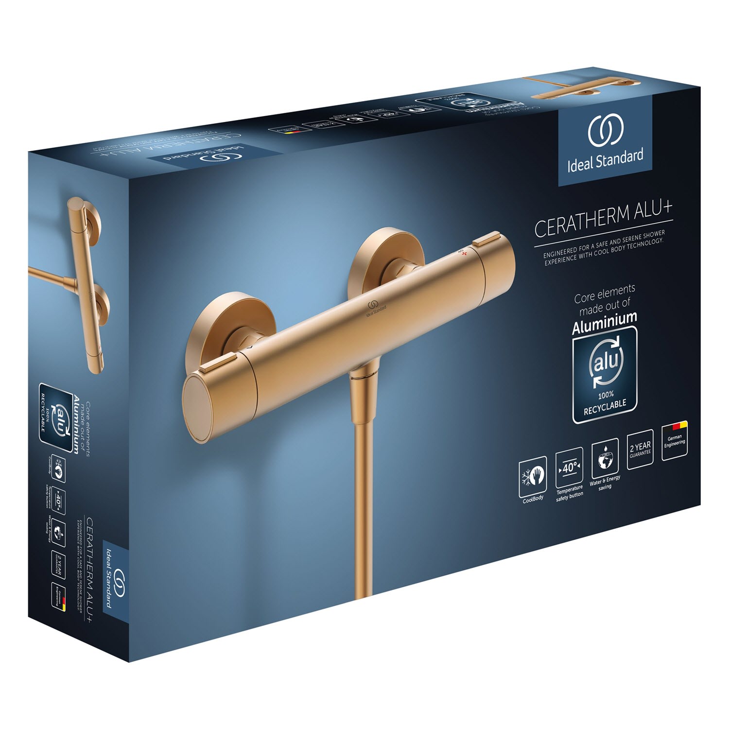 Erleben Sie vollendeten Duschkomfort mit dem Ceratherm Alu+ Brausethermostat von Ideal Standard. Das hochwertige Aluminiumdesign aus 100 % recyceltem Aluminium vereint moderne Ästhetik mit maximaler Wasserreinheit – ganz ohne Chrom oder Nickel. Die langlebige PreciTherm-Kartusche sorgt für präzise Temperaturkontrolle und perfekten Komfort ohne Nachjustieren. Das Thermostat schützt zuverlässig vor Verbrühungen durch die CoolBody-Technologie und die Sicherheitssperre bei 40°C verhindert zu heiße Wassertemperaturen. Für ein nachhaltiges Duscherlebnis, das Komfort, Sicherheit und Umweltbewusstsein perfekt vereint.