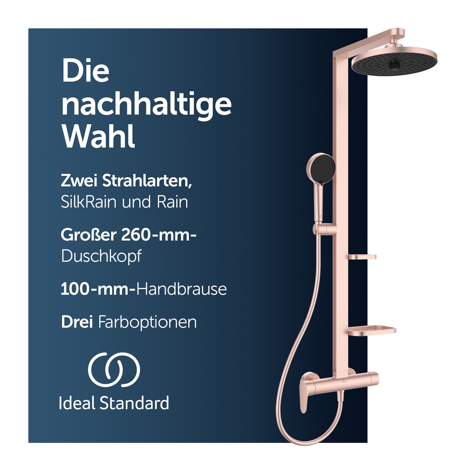 Das Alu+ Duschsystem von Ideal Standard ist nachhaltig, da es aus 84 % recyceltem Aluminium hergestellt wird und 100 % recycelbar ist. Die Verwendung von recyceltem Aluminium reduziert den Ressourcenverbrauch und minimiert Abfall. Es ist frei von Chrom, Blei und Nickel. Das Alu+ Duschsystem ist Teil eines nachhaltigen Ansatzes für die Badgestaltung, der die Umwelt schont.
