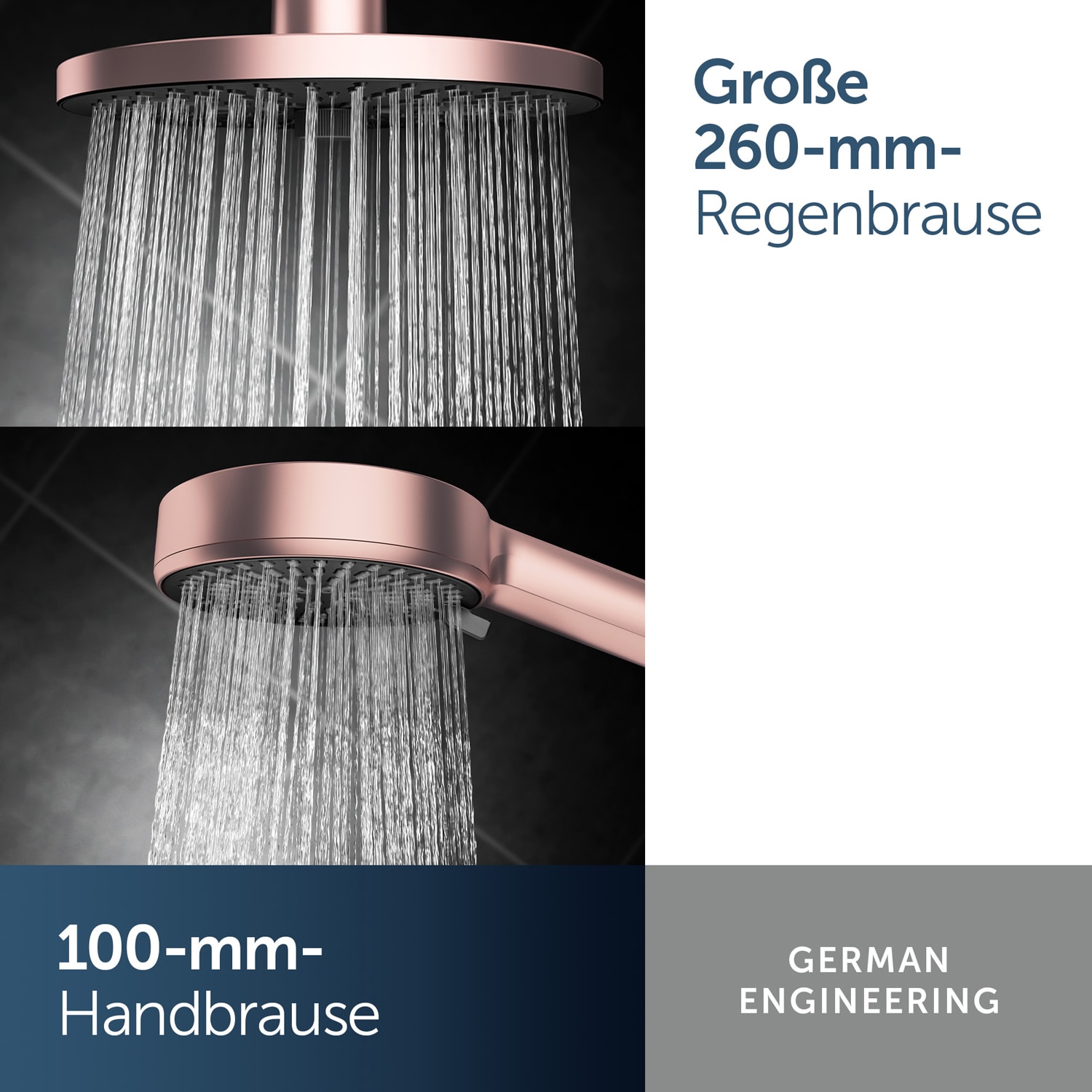 - Reduzierter Wasserverbrauch: auf 8 l/min bei der Handbrause und 12 l/min bei der Kopfbrause