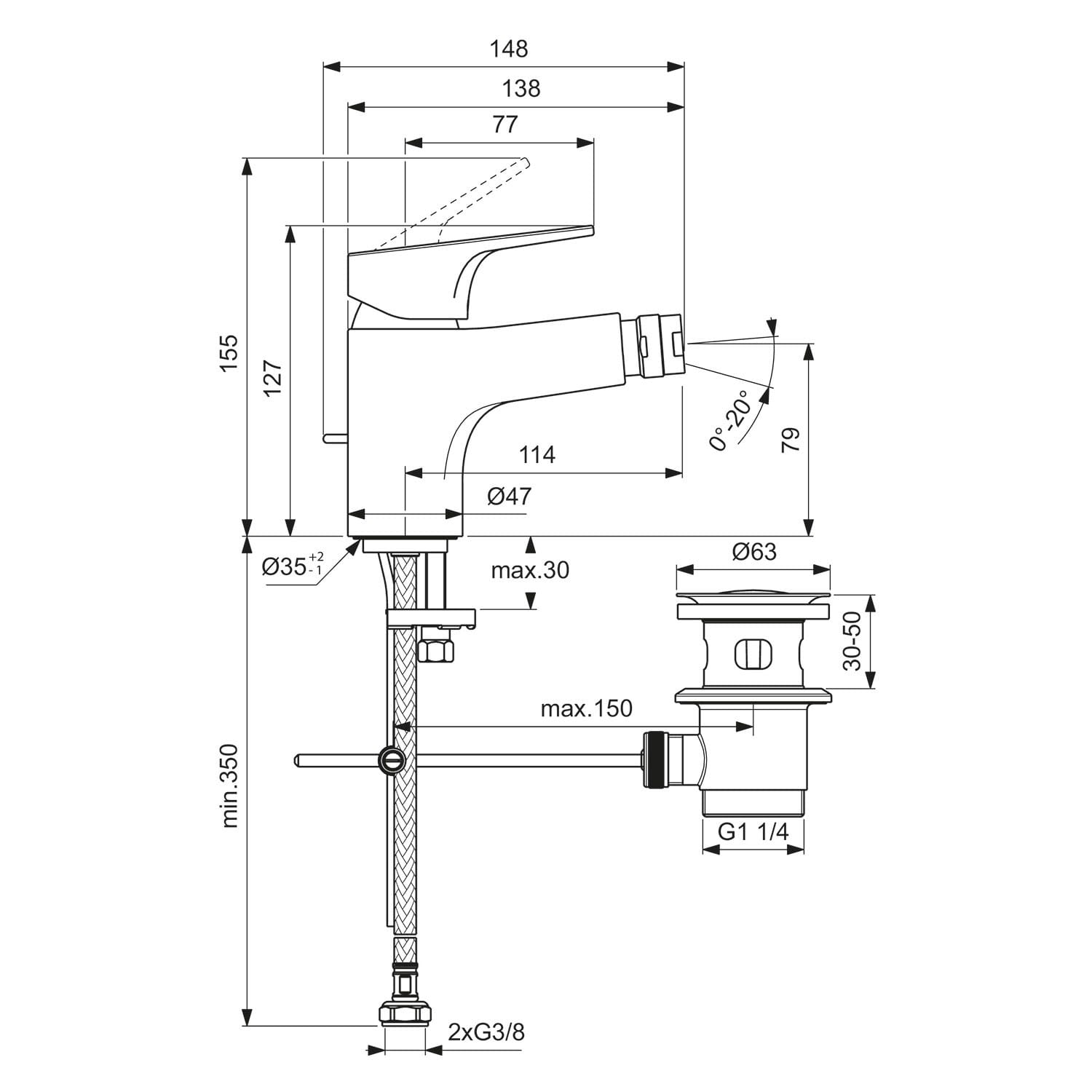Ideal Standard Cerabase Bidetarmatur mit Ablaufgarnitur Ausladung 11,4 cm