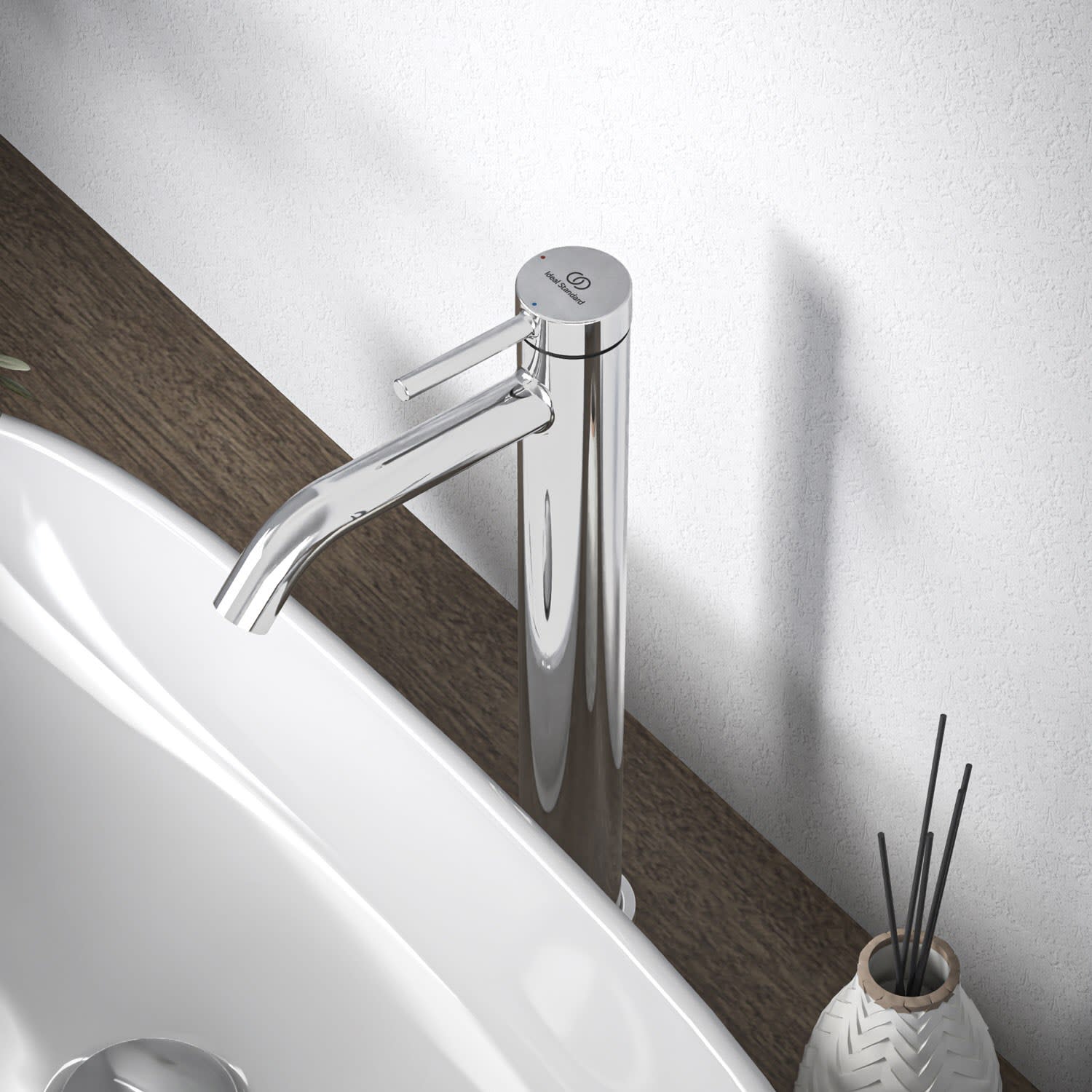 Die Ceraline Nuovo Waschtischarmatur von Ideal Standard vereint modernes Design mit nachhaltiger Funktionalität. Ihr schlankes, elegantes Design sorgt für eine einzigartige Ästhetik, die jedem Badezimmer einen Hauch von Raffinesse verleiht. Die Waschtischarmatur mit verlängertem Sockel und einer Auslaufhöhe von 24 cm sorgt für ein komfortables und bequemes Benutzererlebnis. Die BlueStart-Funktion spart Energie, Wasser und Geld ohne Komfortverlust durch Kaltwasser bei Hebelmittelstellung. Die Armatur verfügt über eine Schaftverschraubung von unten, die eine besonders einfache und schnelle Installation ermöglicht. Mit einem hochwertigen Metall-Push-Open-Ventil, das den Wasserablauf reguliert, ist die Armatur ebenfalls ausgestattet. Die FirmaFlow®-Kartusche überzeugt durch ihre lange Lebensdauer und ihren hohen Komfort. Sie steuert die Wassertemperatur und den Durchfluss präzise und reduziert den Wasserverbrauch gleichzeitig auf effiziente 3,8 Liter pro Minute. So schont die Armatur die Umwelt und Ihren Geldbeutel, ohne dass Sie Kompromisse machen müssen.