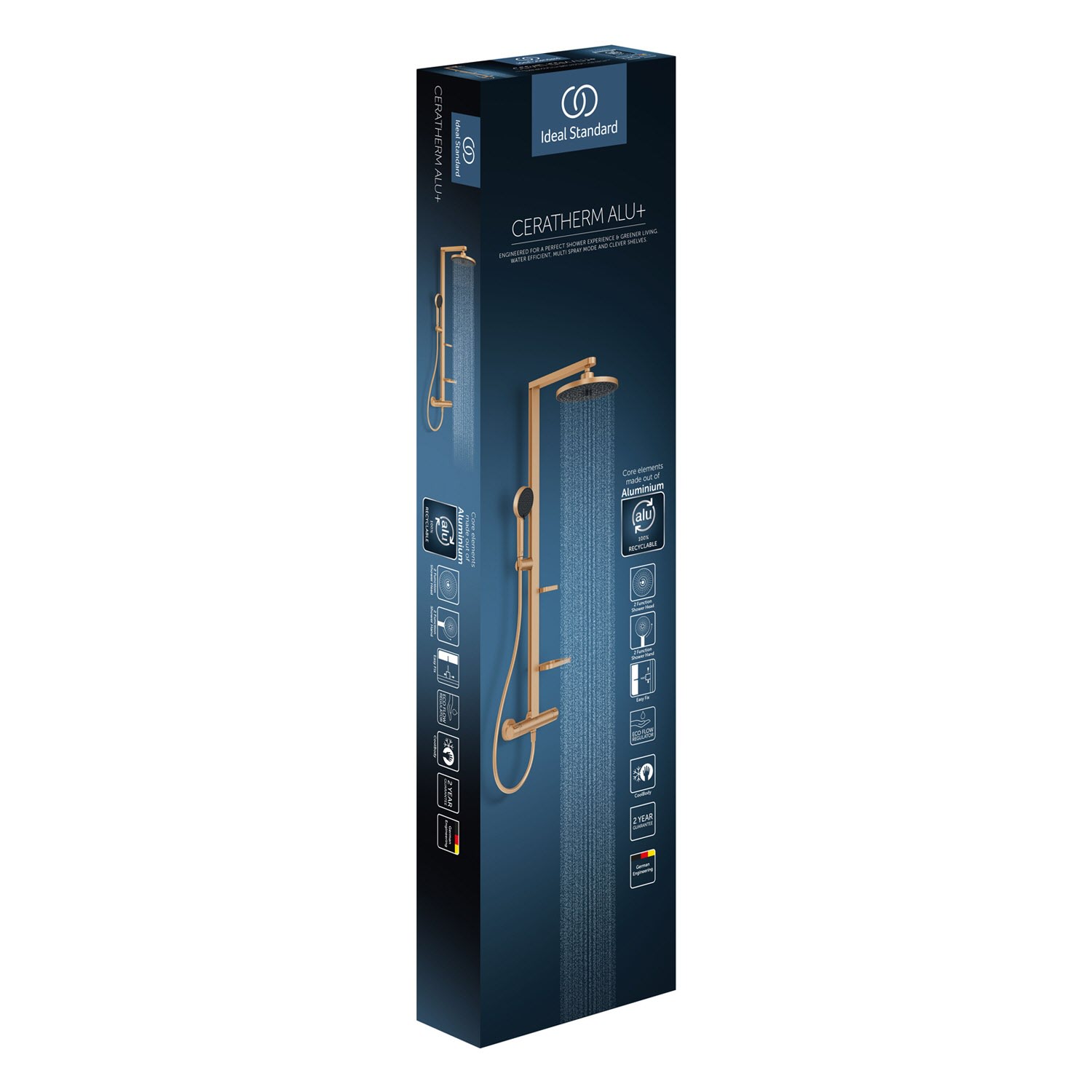 Erleben Sie vollendeten Duschkomfort mit dem Ceratherm Alu+ Duschsystem von Ideal Standard. Das hochwertige Aluminiumdesign aus 100 % recyceltem Aluminium vereint moderne Ästhetik mit maximaler Wasserreinheit – ganz ohne Chrom oder Nickel. Die langlebige PreciTherm-Kartusche sorgt für präzise Temperaturkontrolle und perfekten Komfort ohne Nachjustieren. Das Thermostat schützt zuverlässig vor Verbrühungen durch die CoolBody-Technologie und die Sicherheitssperre bei 40°C verhindert zu heiße Wassertemperaturen. Wählen Sie bei der Handbrause zwischen zwei Strahlarten: dem sanften SilkRain mit ultrafeinen Wassertropfen für ein seidiges Duschgefühl oder dem konzentrierten Rain-Strahl zur Muskelentspannung. Auch die Kopfbrause bietet zwei Strahlarten: Der Rain-Strahl sorgt für gleichmäßige Wasserverteilung, während SilkRain mit feinem, weichem Wasserstrahl für besondere Wohlfühlmomente sorgt. Herausnehmbare Ablagen bieten praktischen Stauraum für Ihre Duschutensilien und können flexibel an der Brausestange positioniert werden. Für ein nachhaltiges Duscherlebnis, das Komfort, Sicherheit und Umweltbewusstsein perfekt vereint.