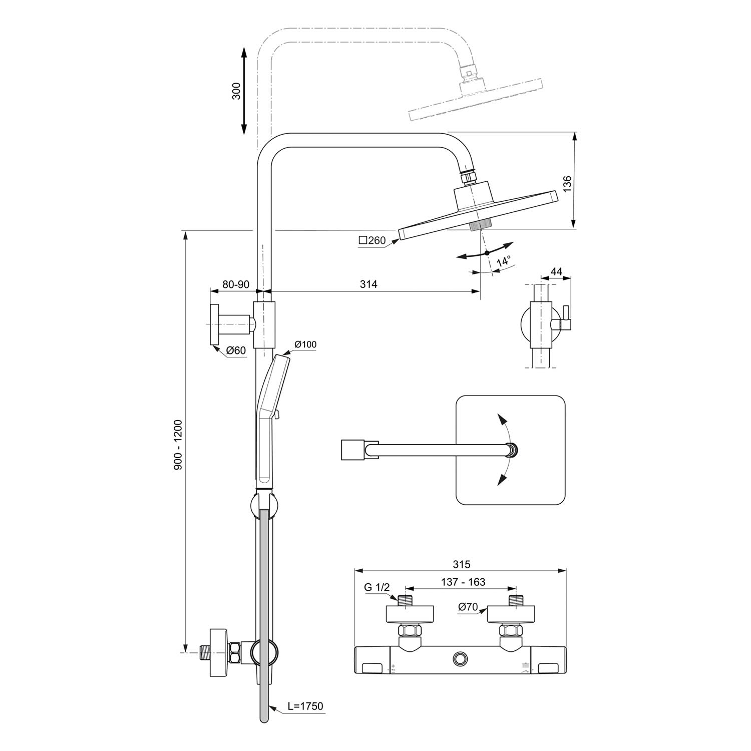 Ideal Standard Ceratherm T25+ Duschsystem, Kopfbrause eckig