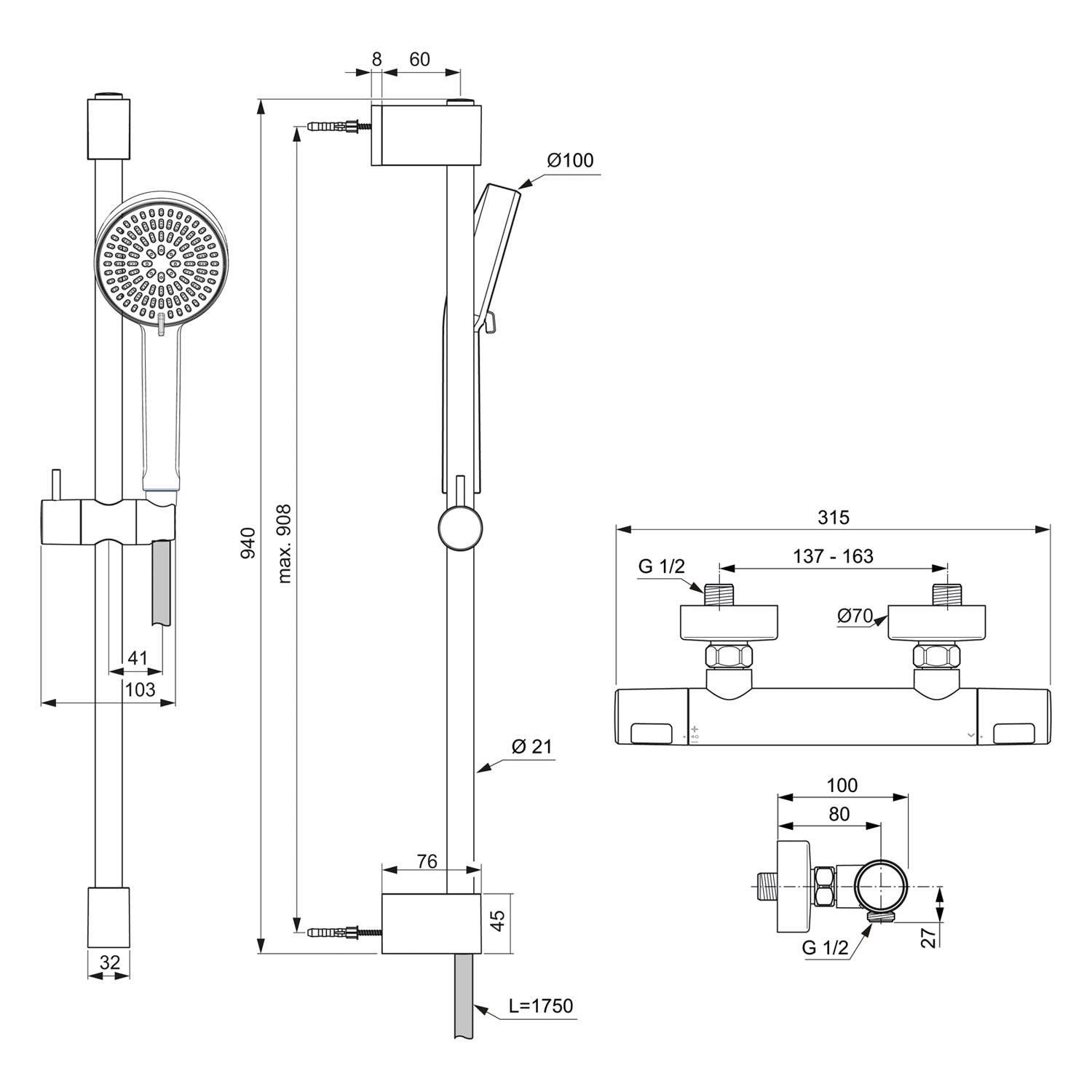 Ideal Standard Ceratherm T25 N Duscharmatur Paket, Handbrause rund, wassersparend