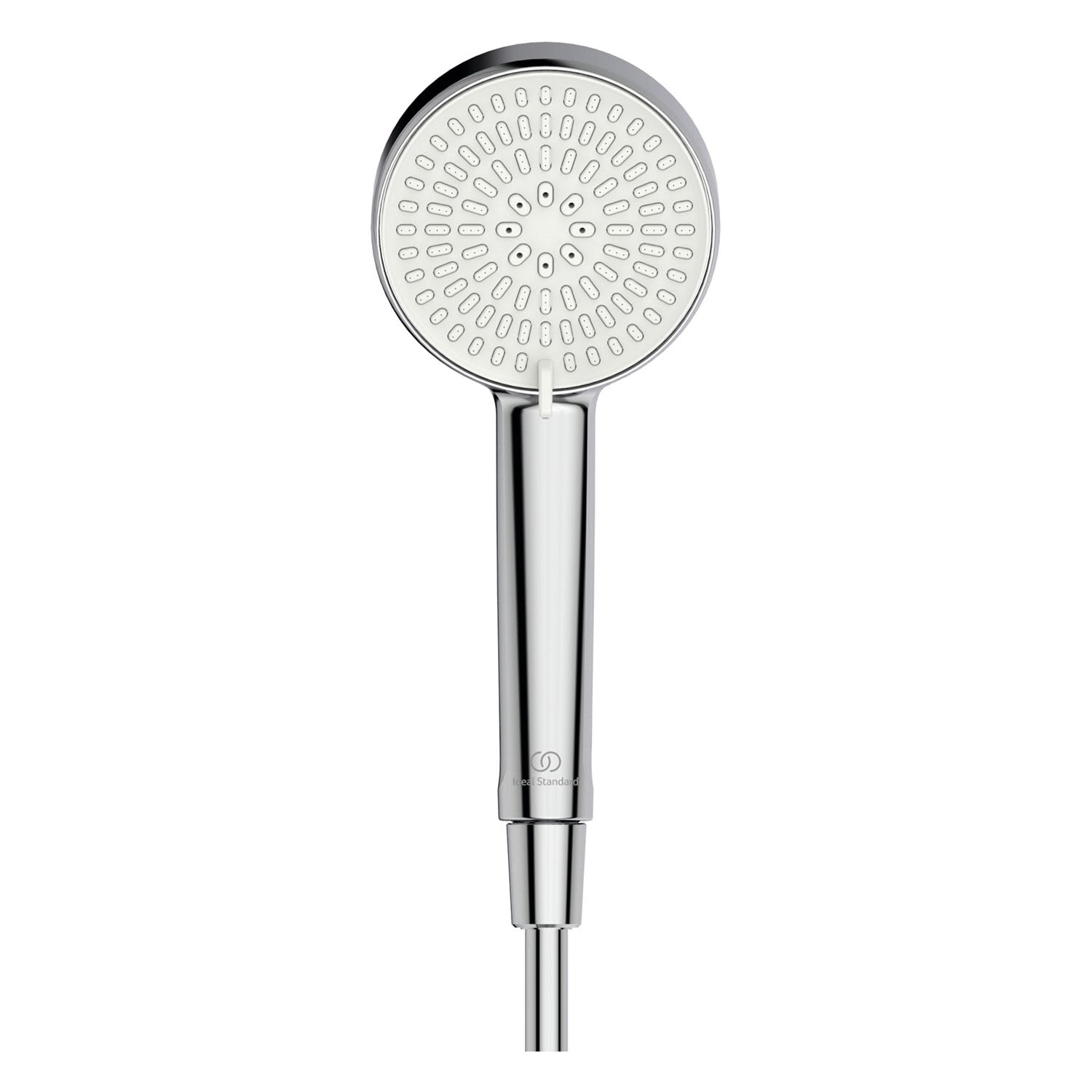 Mit dem Ideal Standard Duschsystem aus der Serie Ceratherm T25 erwarten Sie wohltuende Duschmomente für pure Entspannung, kombiniert mit umweltfreundlicher Technologie. Sie können mit der Handbrause zwischen zwei Funktionen wählen: Entspannen Sie sich mit dem sanften Regen und seinen ultrafeinen Wassertröpfchen oder genießen Sie eine belebende Massage mit dem Massagestrahl. Die Regenbrause verwöhnt Sie ebenfalls und sorgt für ein belebendes Duscherlebnis. Beide Brausen sind dank der EasyClean-Funktion einfach zu reinigen, Kalkablagerungen an den Silikondüsen lassen sich mit einem leichten Wischen entfernen.