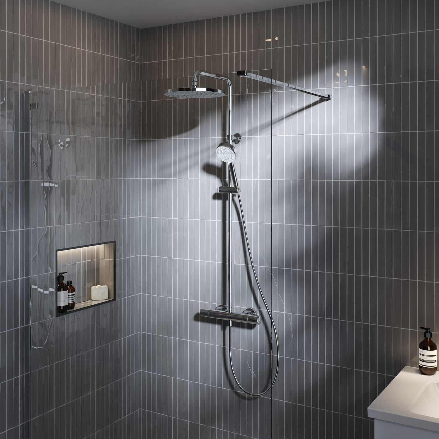 Mit dem Ideal Standard Duschsystem aus der Serie Ceratherm T25 N erwarten Sie wohltuende Duschmomente für pure Entspannung, kombiniert mit umweltfreundlicher Technologie. Mit ihrem modernen und eleganten Design fügt sich die Ceratherm T25 N Kollektion perfekt in jedes Badezimmer ein und verleiht ihm einen individuellen Stil. Sie können mit der Handbrause zwischen zwei Funktionen wählen: Entspannen Sie sich mit dem sanften Regen und seinen ultrafeinen Wassertröpfchen oder genießen Sie eine belebende Massage mit dem Massagestrahl. Die Kopfbrause verwöhnt Sie ebenfalls mit zwei Strahlarten, sanftem Regen für eine entspannende Atmosphäre oder kräftigem Regen für ein belebendes Duscherlebnis. Beide Brausen sind dank der EasyClean-Funktion einfach zu reinigen, Kalkablagerungen an den Silikondüsen lassen sich mit einem leichten Wischen entfernen.