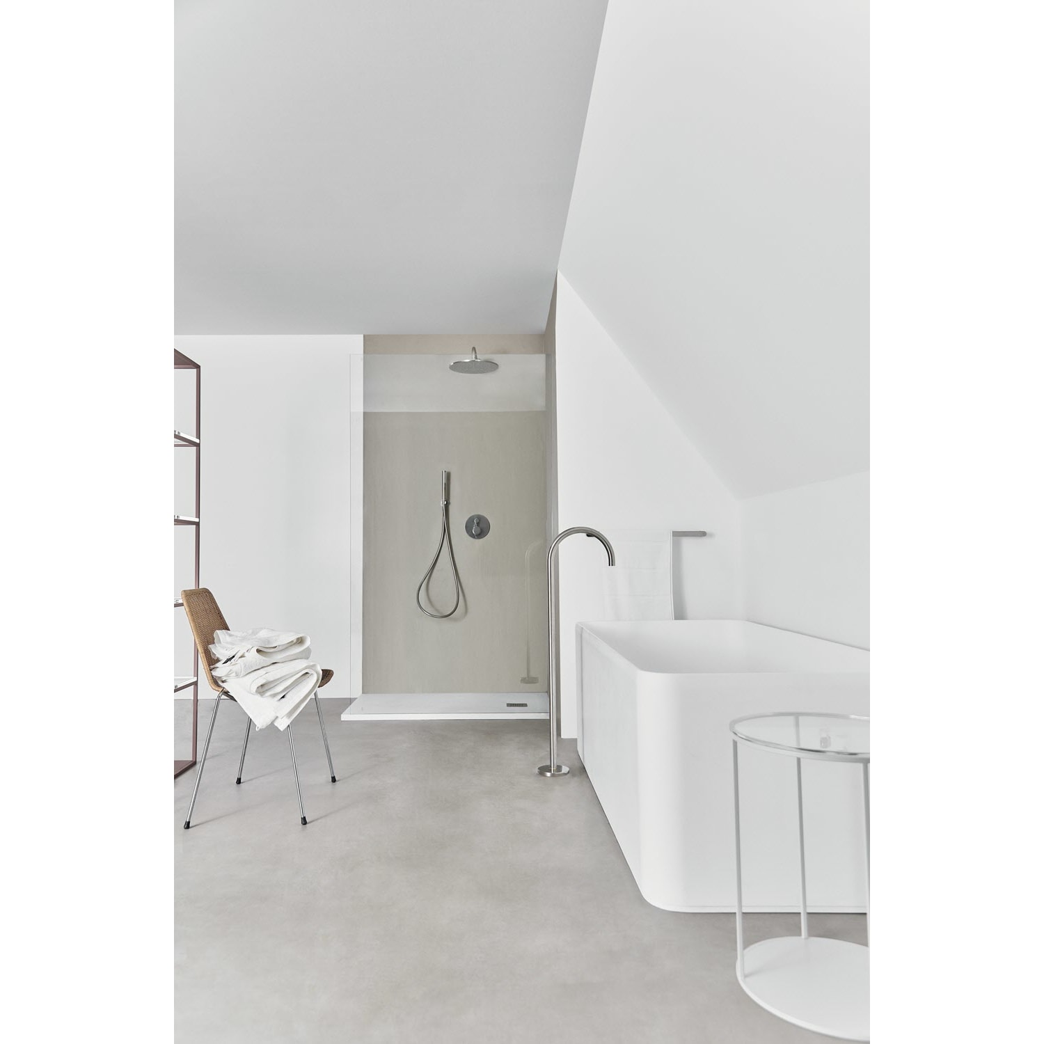 Die schlanke, nur 10 mm hohe Wandrosette aus Metall bietet Langlebigkeit und einen eleganten, minimalistischen Look, der sich perfekt in moderne Badezimmer einfügt.
