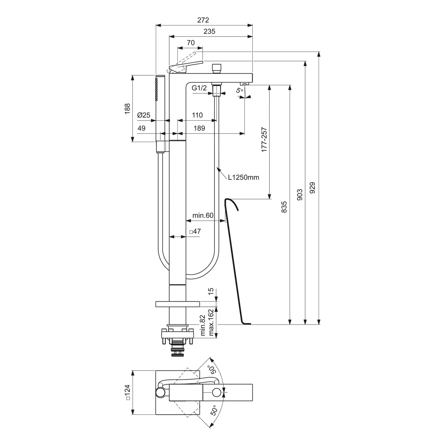Ideal Standard Extra freistehende Badewannen-Armatur, mit Stick-Handbrause, Ausladung 18,9 cm