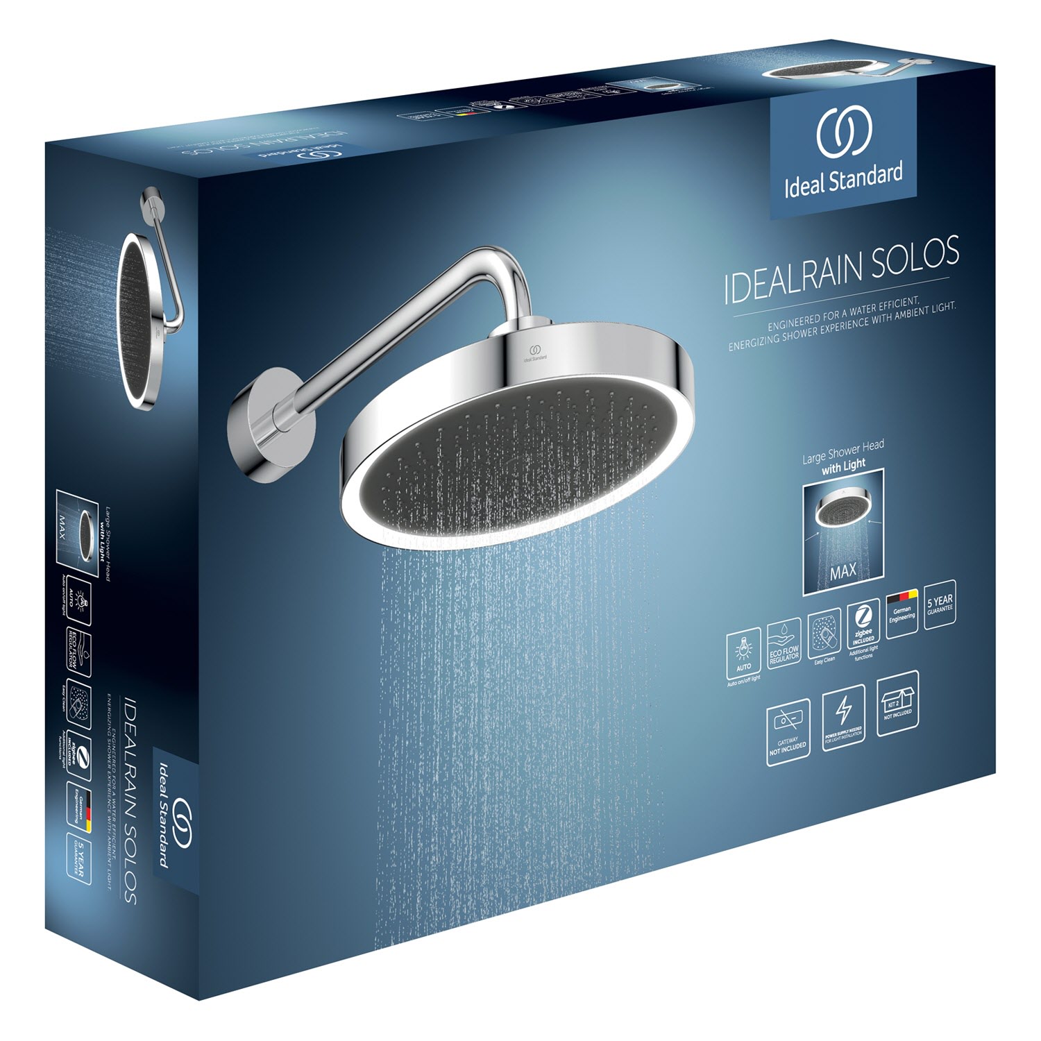 Die Solos LED-Kopfbrause ist das Highlight in der Dusche. Der LED-Leuchtring wird durch einen Näherungssensor automatisch aktiviert und erstrahlt in weißem Licht. In Verbindung mit einer vorhandenen Zigbee Smart-Home Lösung, lässt sich die Lichtfarbe verändern. Für ein unvergleichliches Duscherlebnis sorgt die Strahlart "sanfter Regen".