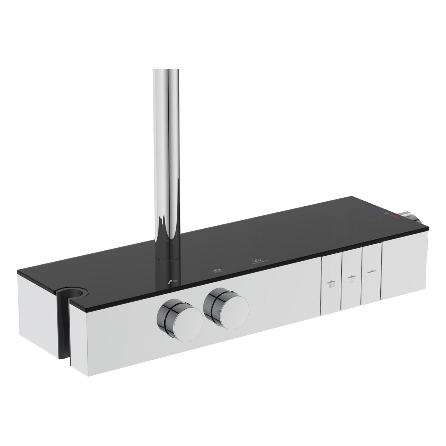 Die thermostatischen Duschsysteme der Kollektion Solos von Ideal Standard bringen Komfort und Design in Ihr Bad: Das Aufputz-Brausethermostat Ceratherm mit integrierter Ablage aus Sicherheitsglas bietet zusätzlichen Stauraum für Ihre Duschutensilien. Dank der smarten Navigo® Technologie lässt sich das Wasservolumen ganz einfach und intuitiv bedienen, auch die Strahlarten der Kopfbrause lassen sich ganz bequem direkt über die Armatur wechseln. Die Kopf- und Handbrause im minimalistischen Design bieten jeweils drei Strahlfunktionen – und heben so Ihr Duscherlebnis auf ein neues Level.