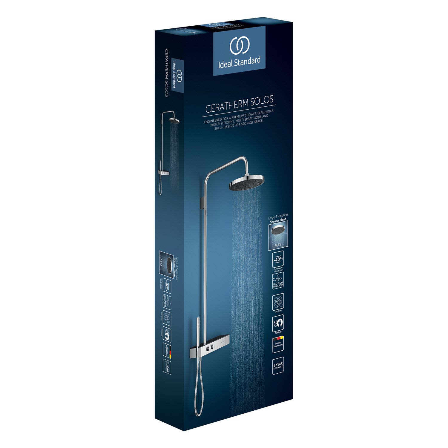 Die thermostatischen Duschsysteme der Kollektion Solos von Ideal Standard schaffen eine sinnliche Atmosphäre in Ihrem Bad. Das Aufputz-Brausethermostat Ceratherm mit Navigo® Technologie ermöglicht die intuitive Steuerung des Wasservolumens – auch die Strahlarten der Kopfbrause lassen sich ganz bequem direkt über die Armatur wechseln. Die 3-Funktions-Kopfbrause und die handliche Stab-Handbrause im minimalistischen Design heben Ihr Duscherlebnis auf ein neues Level. Die integrierte Ablage aus Sicherheitsglas bietet praktischen Stauraum für Ihre Duschutensilien – für Komfort und Design, das begeistert.
