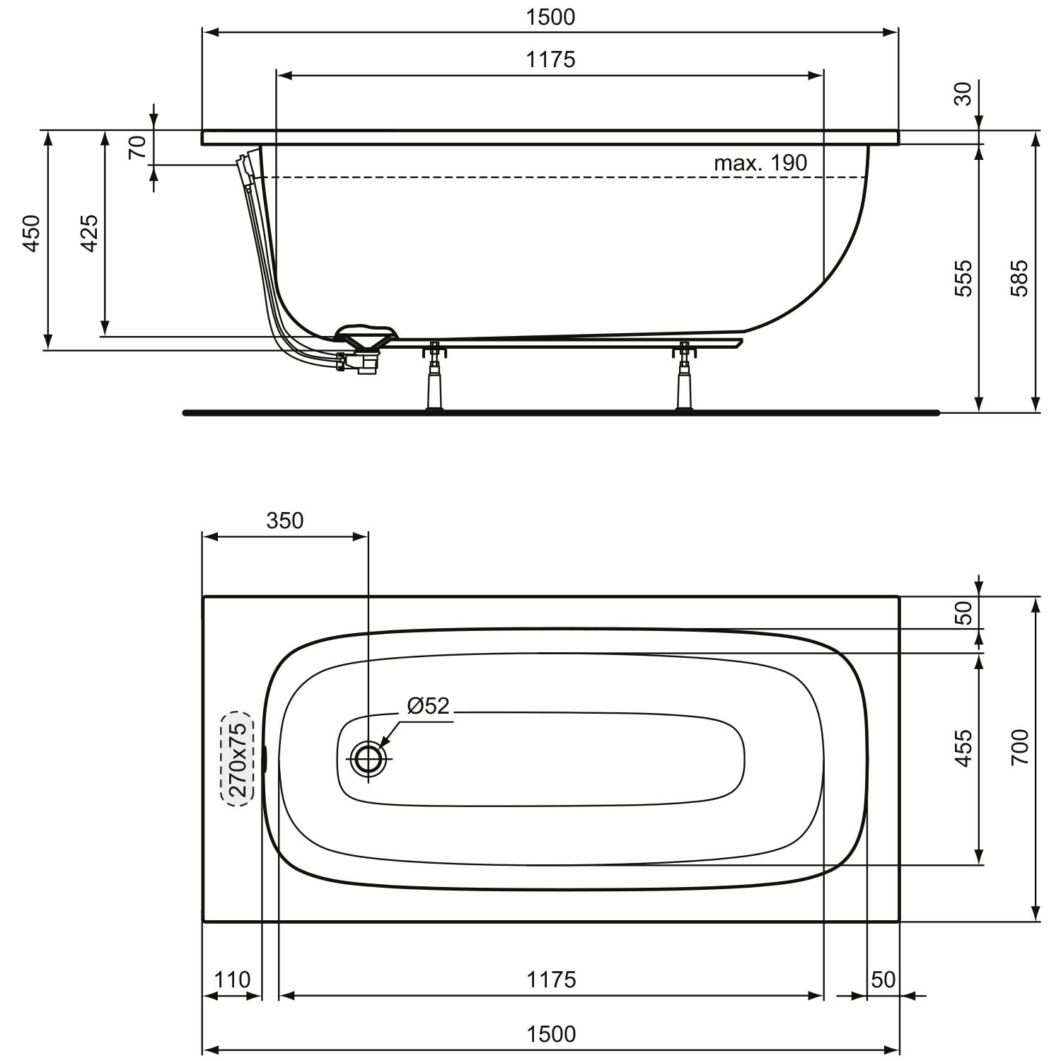 Ideal Standard i.life Körperform-Badewanne 150 x 70 cm