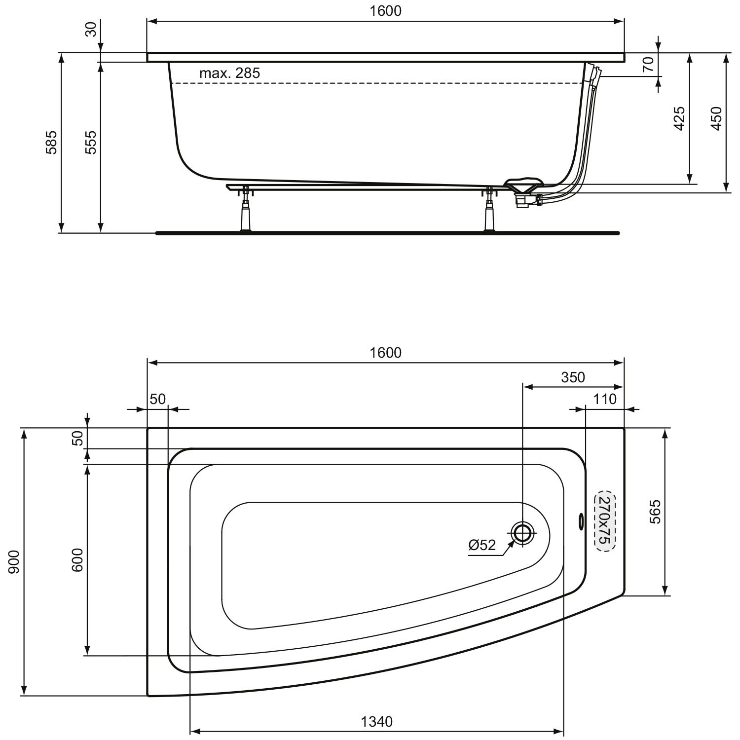 - Position Ablaufloch: Fußende rechts