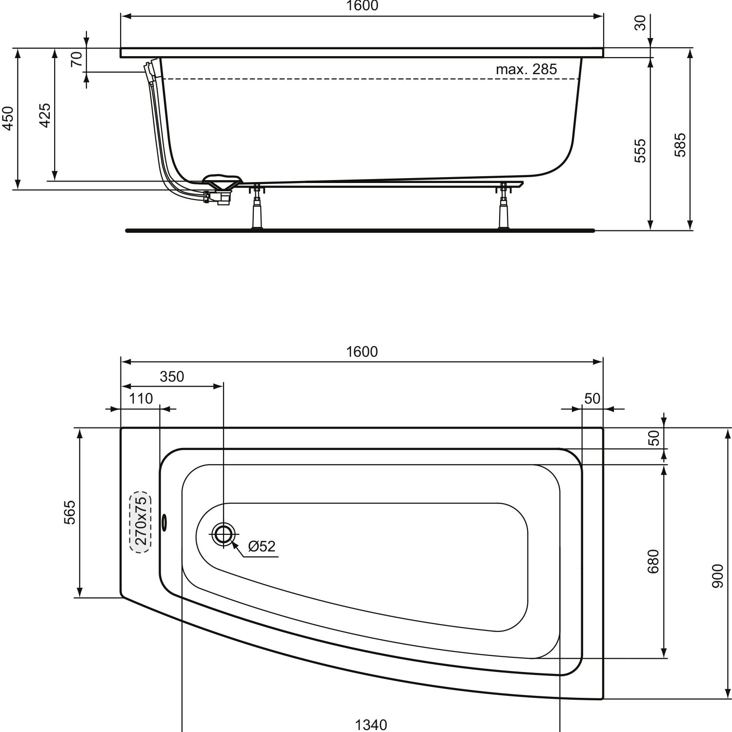 - Position Ablaufloch: Fußende links