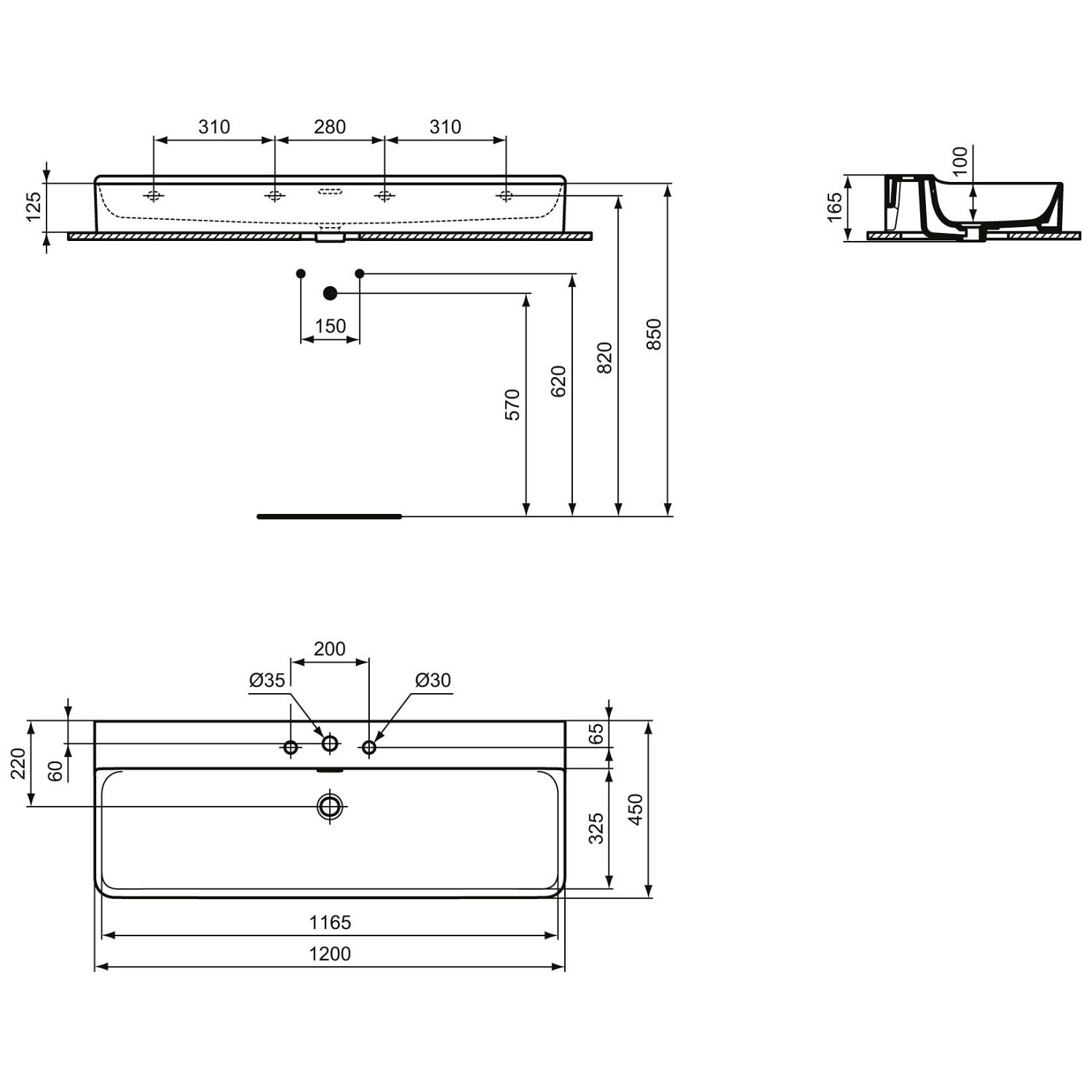 Ideal Standard Conca Waschtisch 120 cm, 3 Hahnlöcher, mit Überlauf, geschliffen