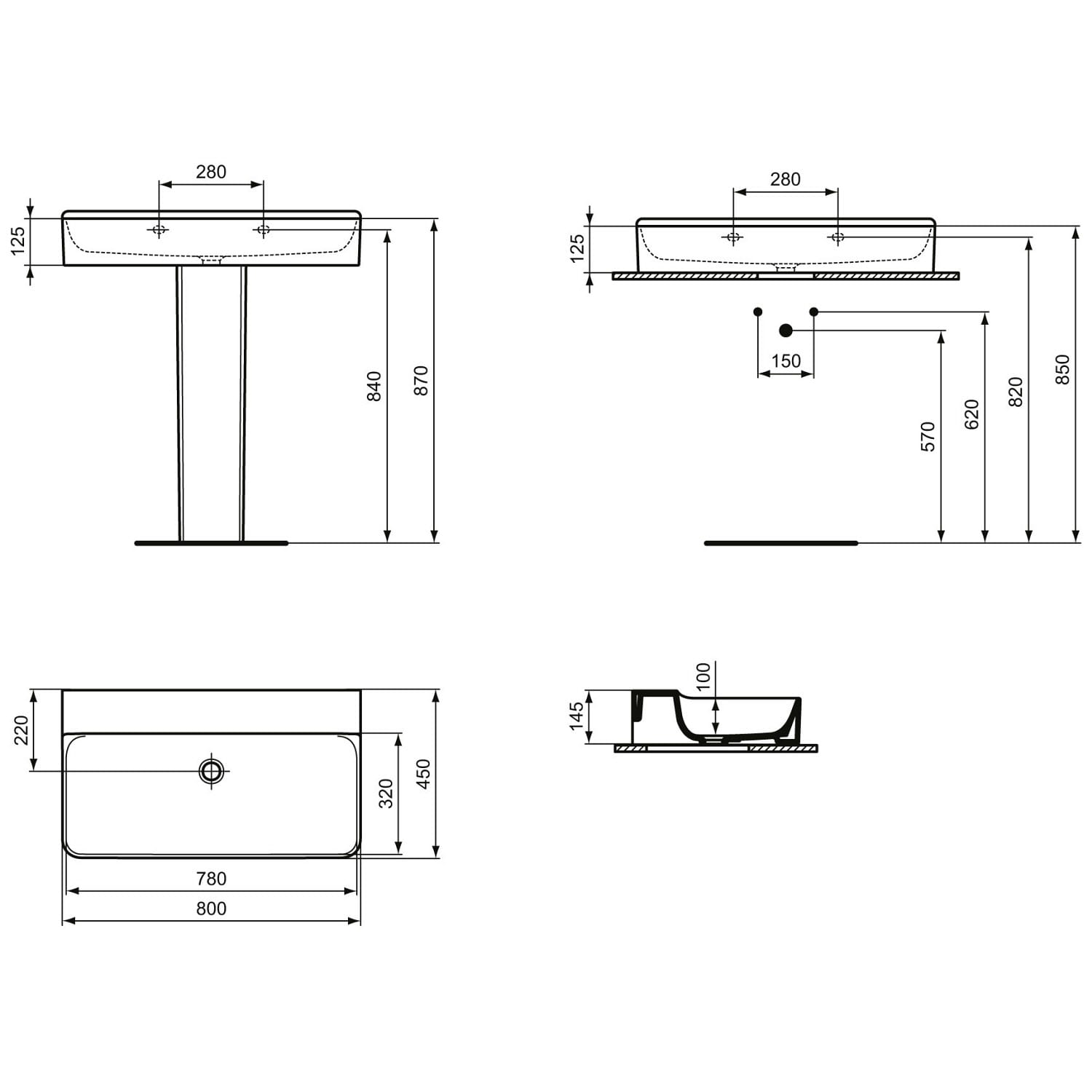 Ideal Standard Conca Waschtisch 80 cm, ohne Hahnloch, ohne Überlauf