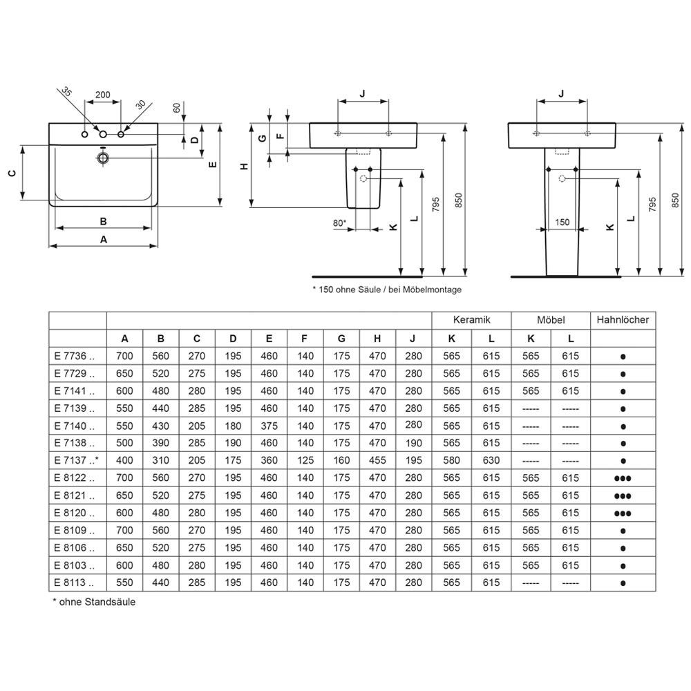 Ideal Standard Connect Waschtisch 50 cm, mit 1 Hahnloch, mit Überlauf